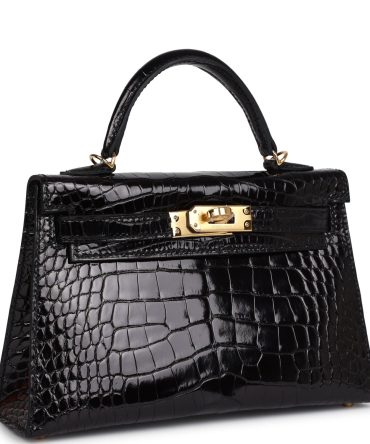 Hermes Kelly Sellier 20 Black Shiny Alligator Gold Hardware