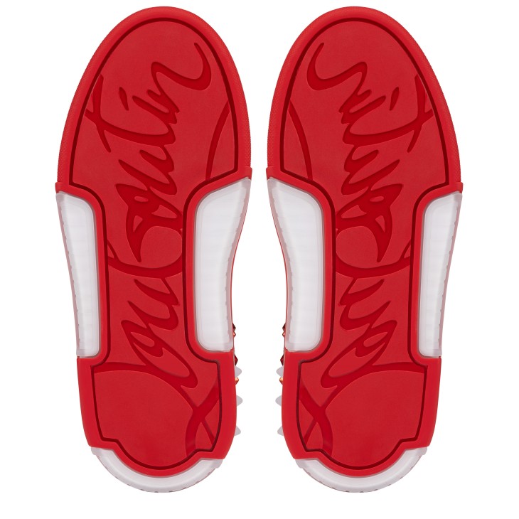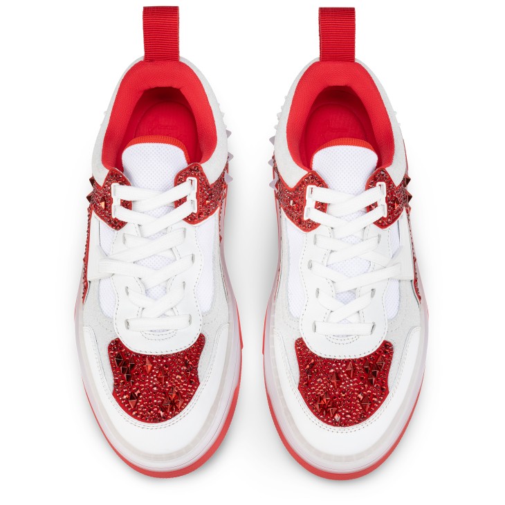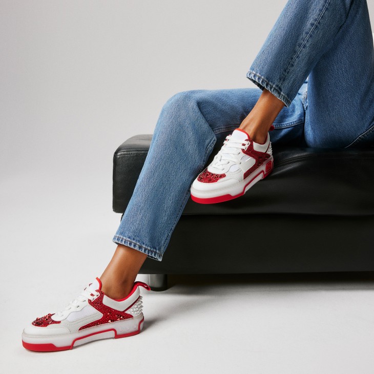Showcasing an array of Maison Christian Louboutin signature details, the Astroloubi is inspired by the basketball sneakers of the 90s. This sophisticated style blends white and Loubi red calf leather. A lightweight, sporty design, this model is finished Eternity Strass, a striking combination of 3 sizes of signature spikes and 4 sizes of strass, meticulously hand placed over 3 to 4 hours.