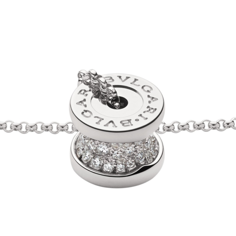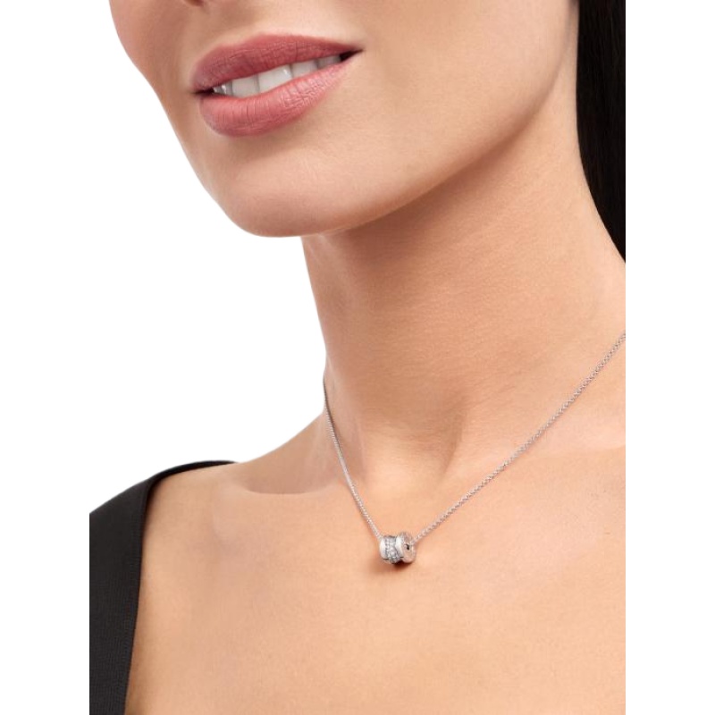 Inspired by the world-famous amphitheater, the Colosseum, the B.zero1 necklace is a true expression of Bvlgari’s creative vision, challenging the very essence of jewellery design. Its unique, pure spiral shape symbolises the harmony of past, present and future – reflected in the magnificence of the Eternal City – and the pioneering spirit of the collection. B.zero1 necklace in 18K white gold with pavé diamonds.