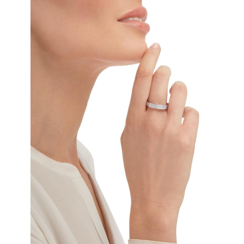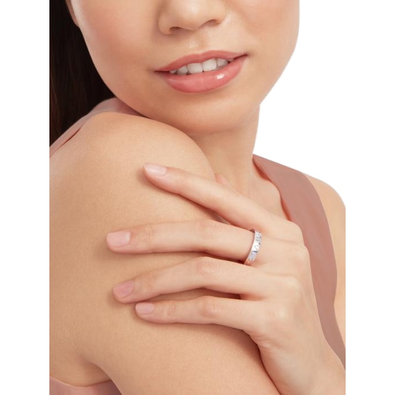 The B.zero1 Essential ring in 18K white gold and set with a single diamond is a modern interpretation of elegance rooted in Bvlgari??s Roman heritage. This ring is a reflection of the collection??s aesthetic, reinterpreting the prestigious Maison??s logo as a unique and timeless design element. This versatile piece can be easily layered to create a variety of modern and timeless looks, and it is a clever way to express your personality.
