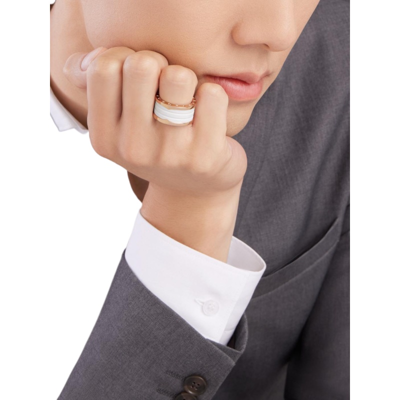 Inspired by the world-famous amphitheater, the Colosseum, the B.zero1 ring is a true expression of Bvlgari??s creative vision, challenging the very essence of jewellery design. Its unique, pure spiral shape symbolises the harmony of past, present and future ?C reflected in the magnificence of the Eternal City ?C and the pioneering spirit of the collection. B.zero1 four-band ring in 18K rose gold, adorned with white ceramic.