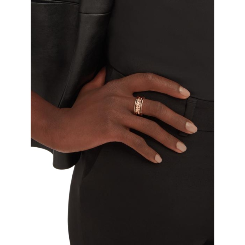 The B.zero1 Rock collection draws inspiration from the world-famous amphitheater, the Colosseum, and reflects Bvlgari??s creative vision and uninhibited style. The unique spiral design is reinterpreted with gold studs, challenging the essence of jewelry aesthetics and highlighting the freedom and forward-looking spirit of Bvlgari??s classic design. B.zero1 Rock series 18K rose gold double ring inlaid with black ceramic.