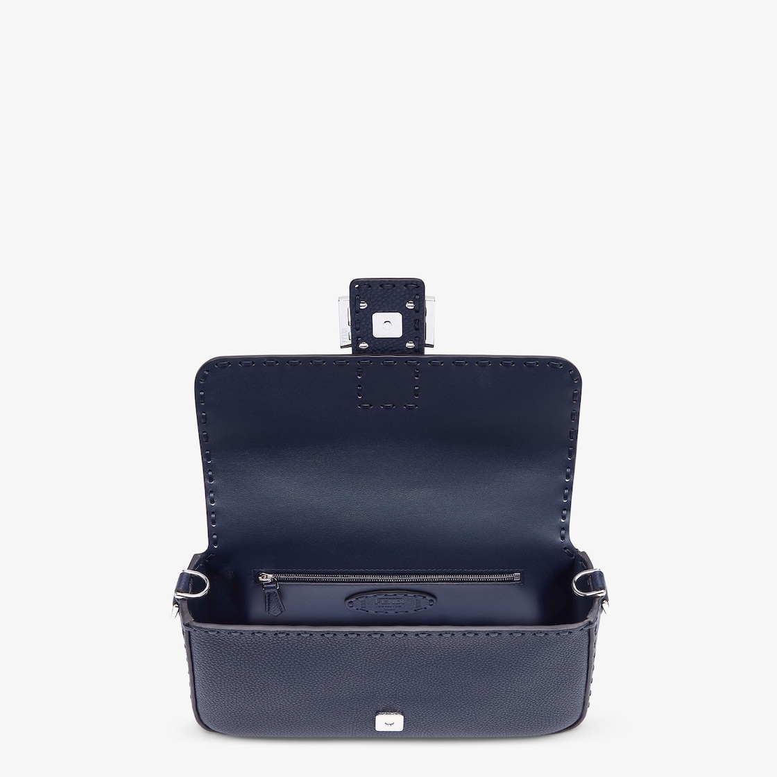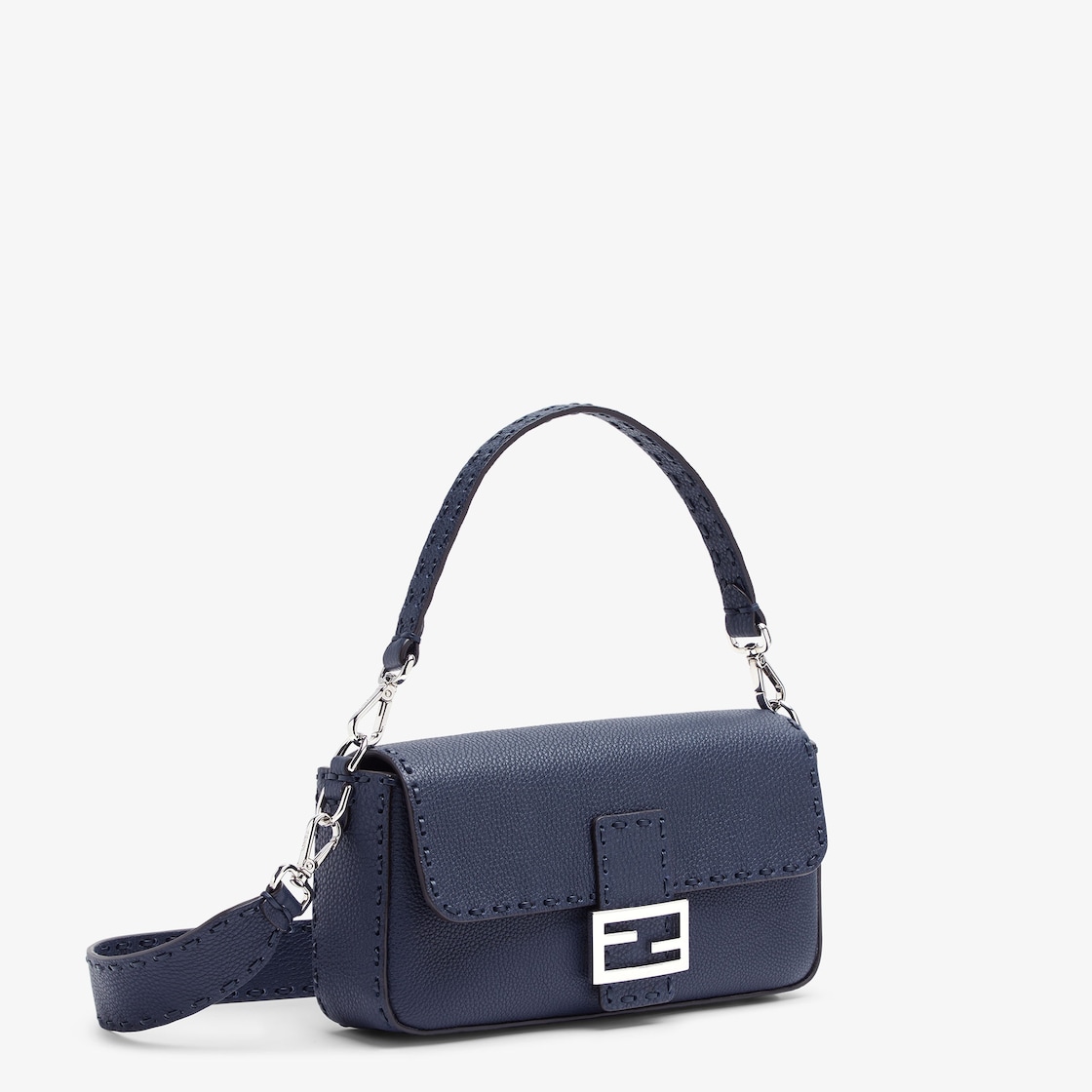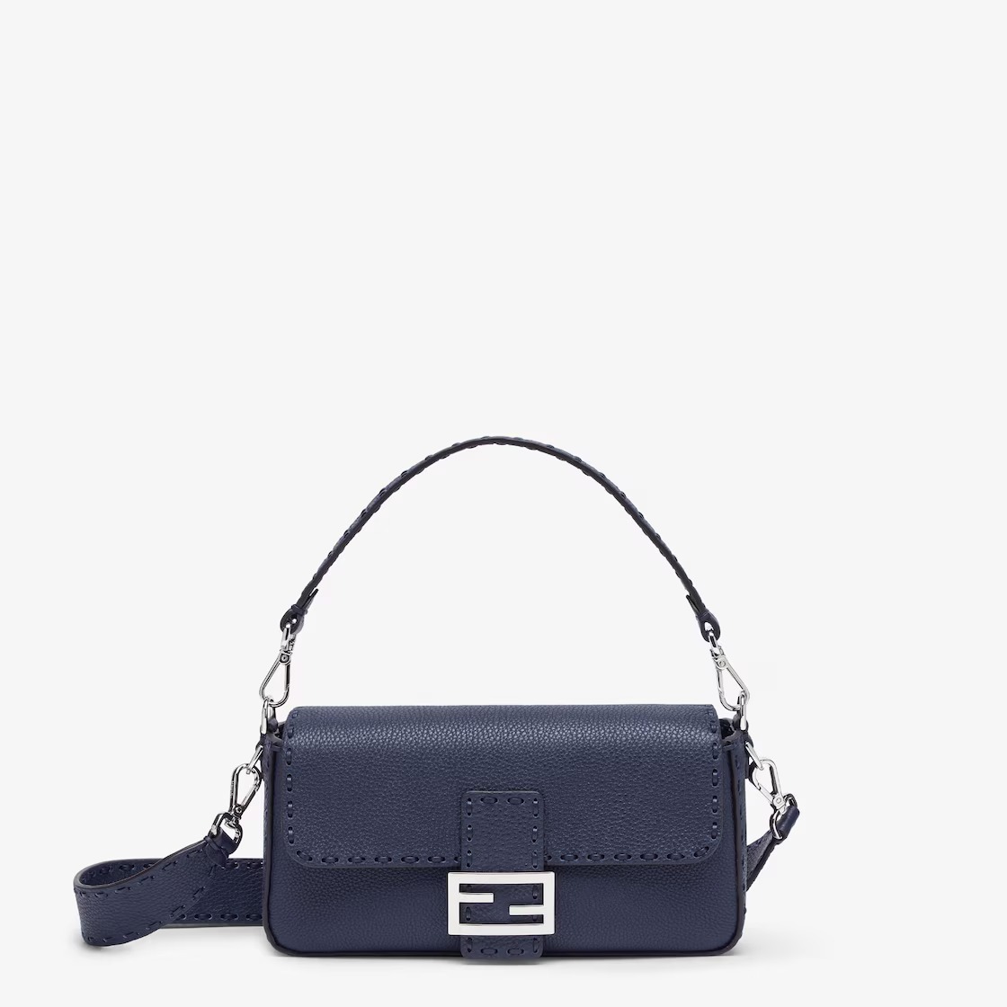 Iconic medium Baguette bag, made of midnight blue Cuoio Romano leather embellished by hand with tone on tone stitching. Decorated with an FF clasp.