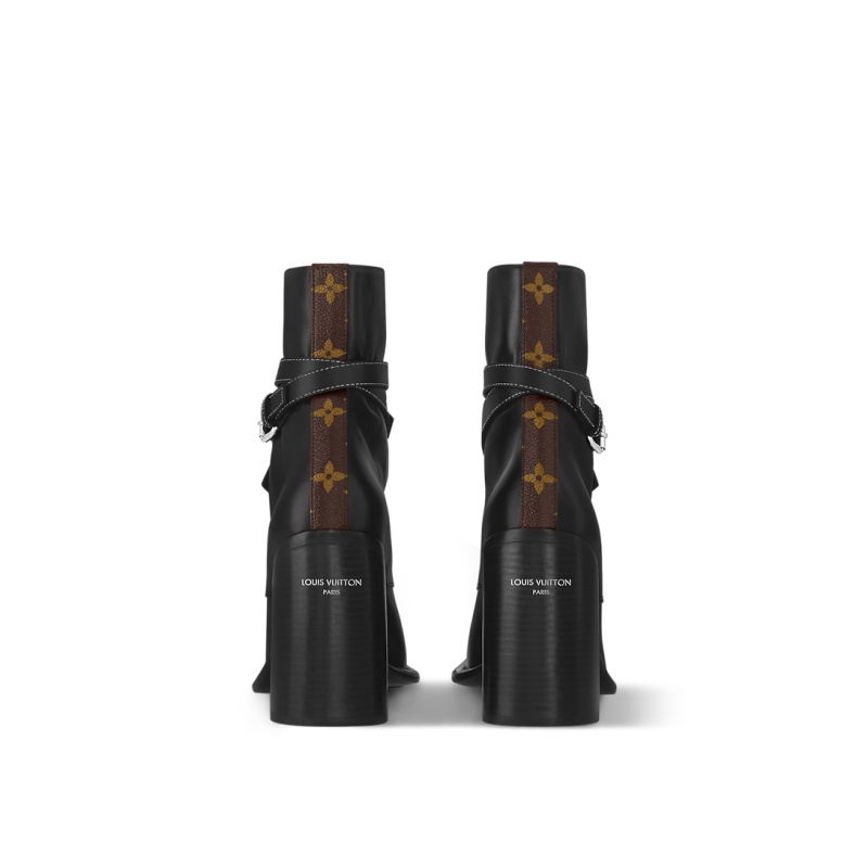 The Berlin ankle boot was a highlight of Nicolas Ghesqui??re’s 10th anniversary show for Louis Vuitton. This version comes in smooth calf leather embellished with a signature knot detail and silver-toned buckle. Other key details are the trim in Monogram canvas at the back and the Louis Vuitton signature hot-stamped on the high block heel.