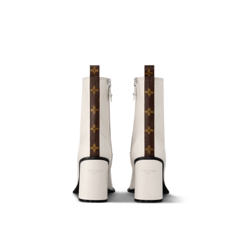 The Berlin ankle boot is crafted from supple calf leather for a stretchy, second-skin effect. The upper is complemented by an equally sleek, leather-covered heel in the shape of a half-Monogram Flower, which is embossed with the Louis Vuitton signature. This model was a highlight of Nicolas Ghesqui??re’s 10th anniversary show for the House.