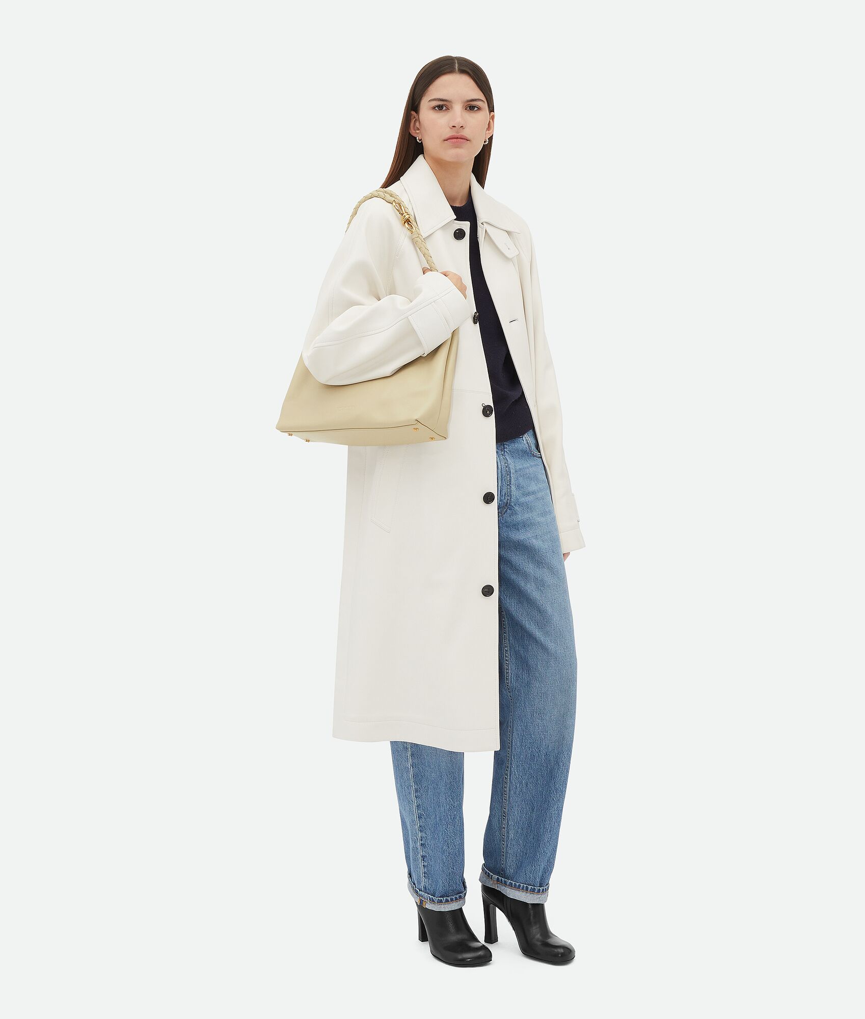 Medium silky calfskin top handle bag with sliding cross-body strap Intrecciato leather internal pocket Magnetic closure