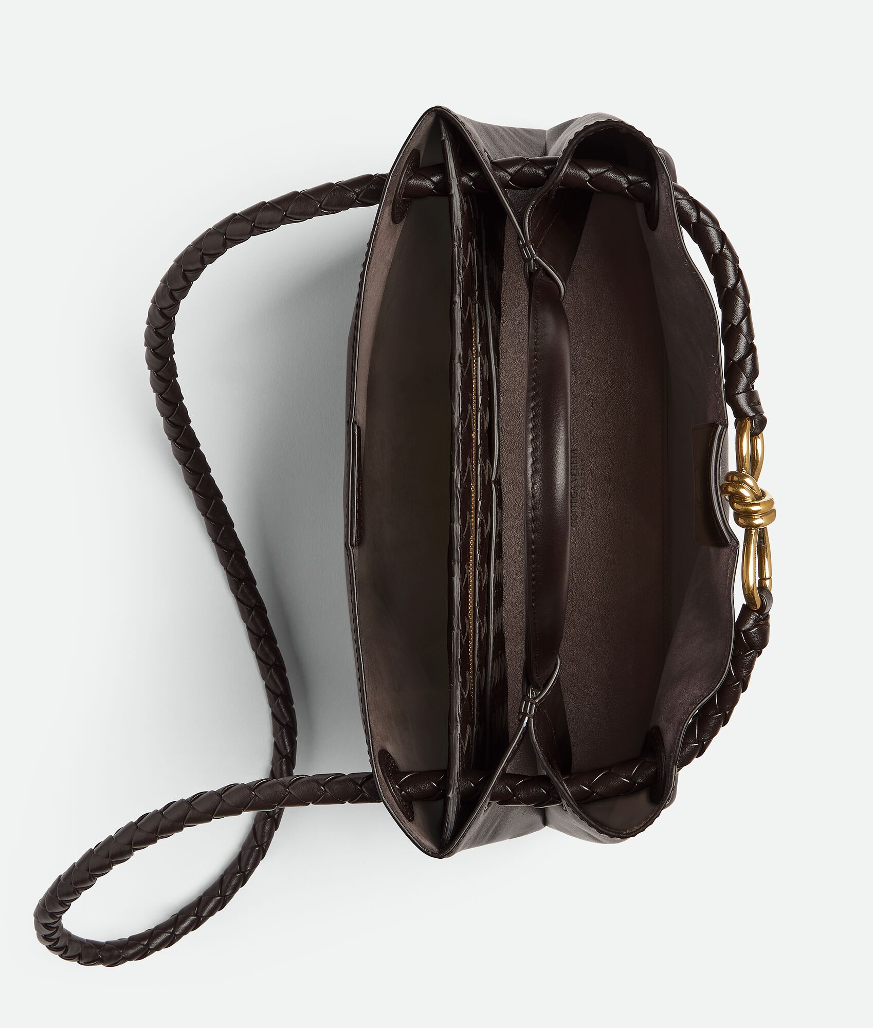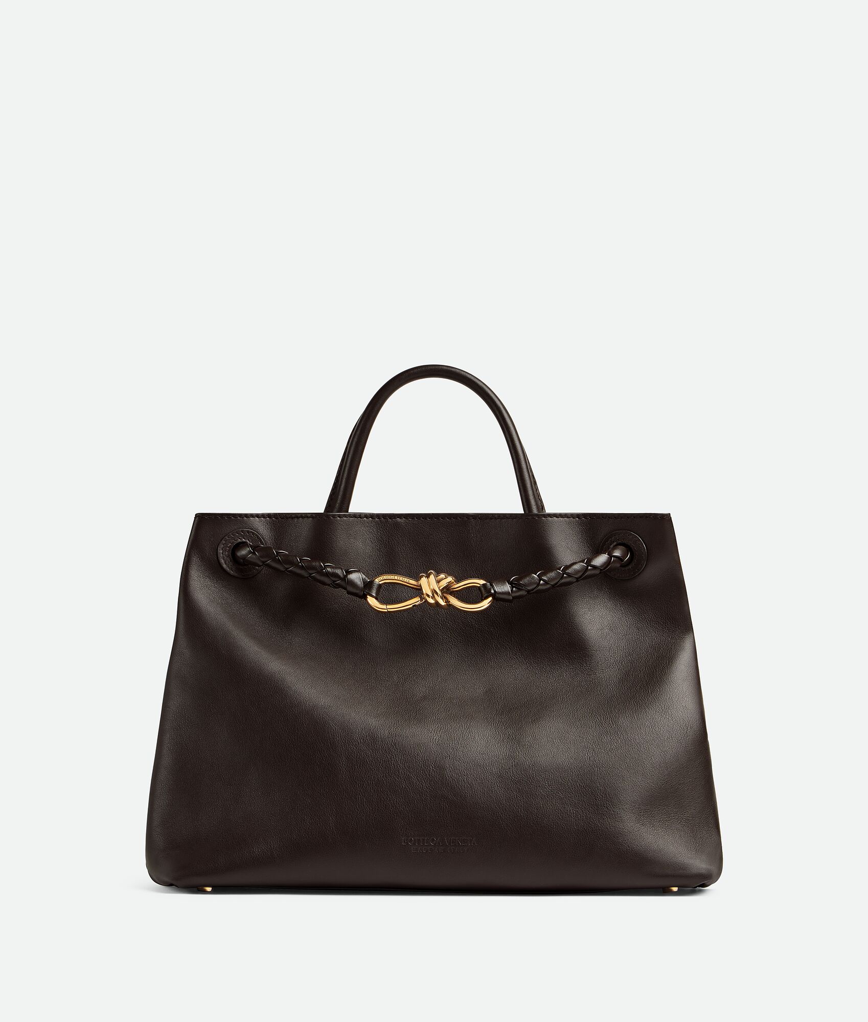 Medium silky calfskin top handle bag with sliding cross-body strap Intrecciato leather internal pocket Magnetic closure