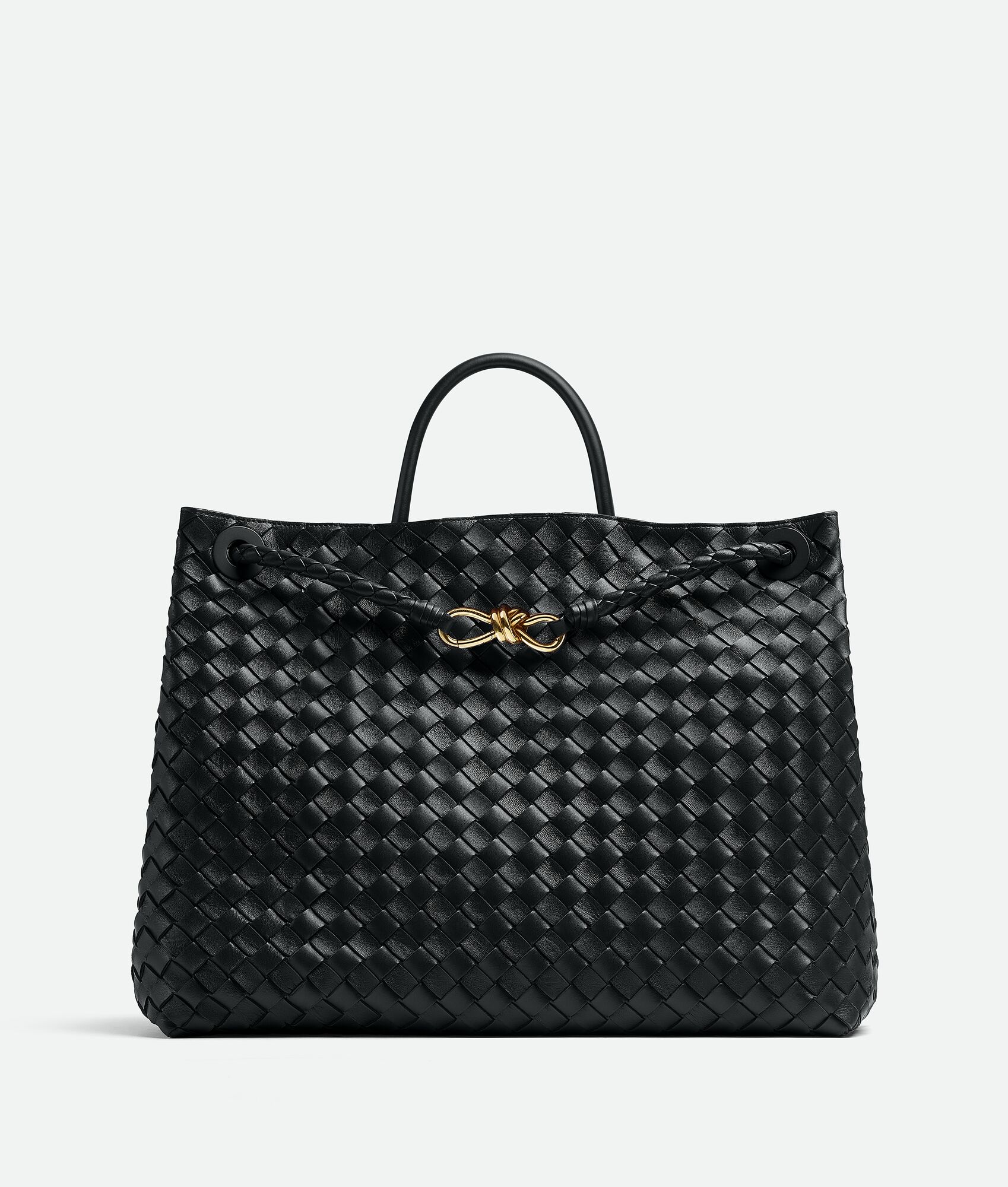 Large Intrecciato leather top handle bag with sliding cross-body strap Compartmented interior with one zippered pocket, two open pockets Magnetic closure