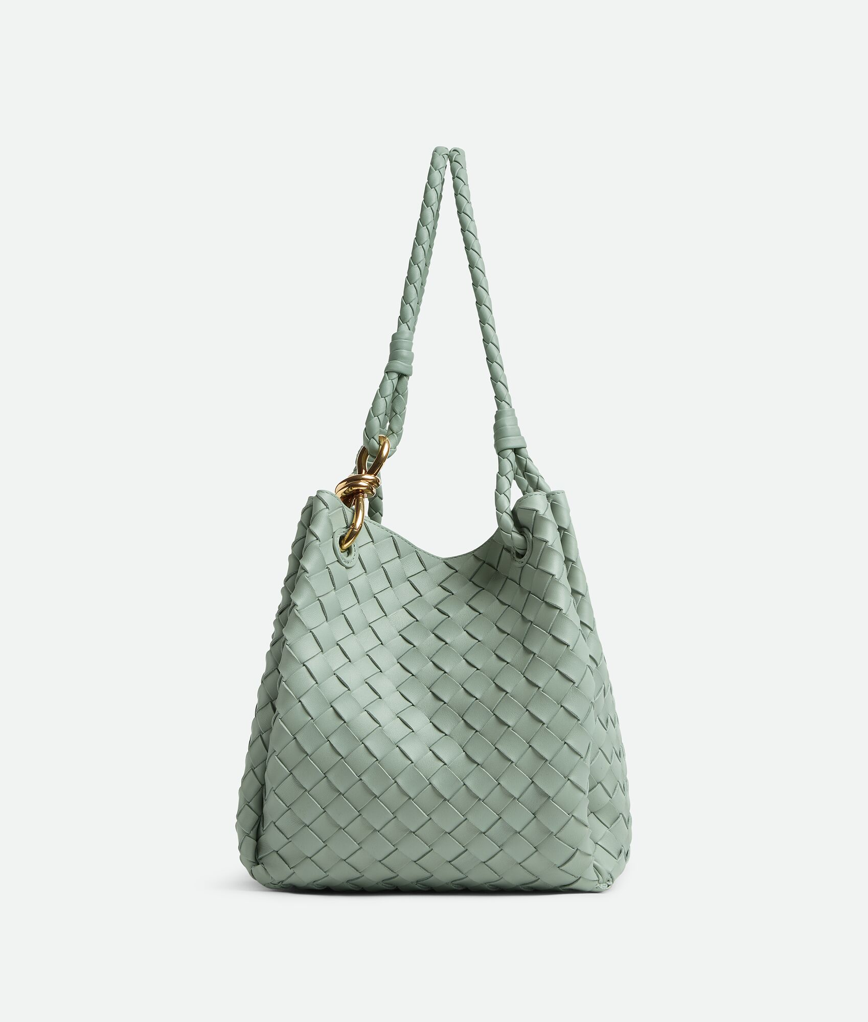 Large Intrecciato leather shoulder bag One main compartment Single detachable interior zipped pocket Magnetic tab closure
