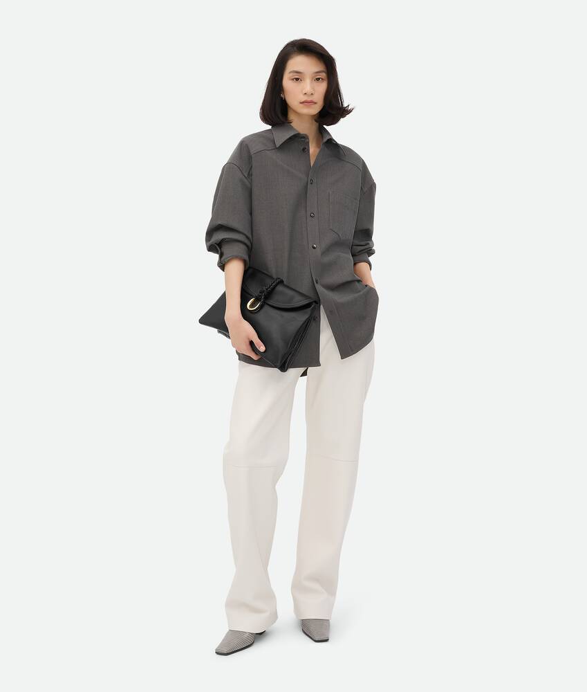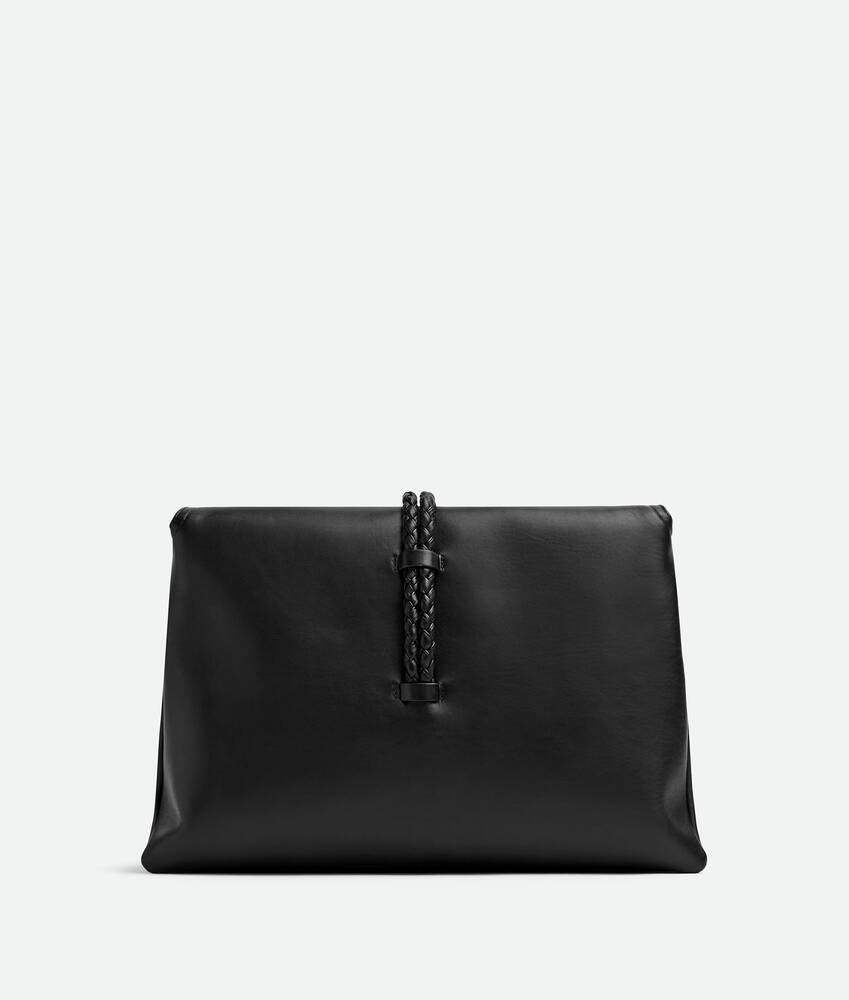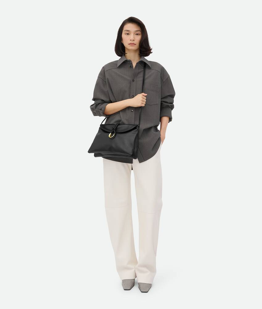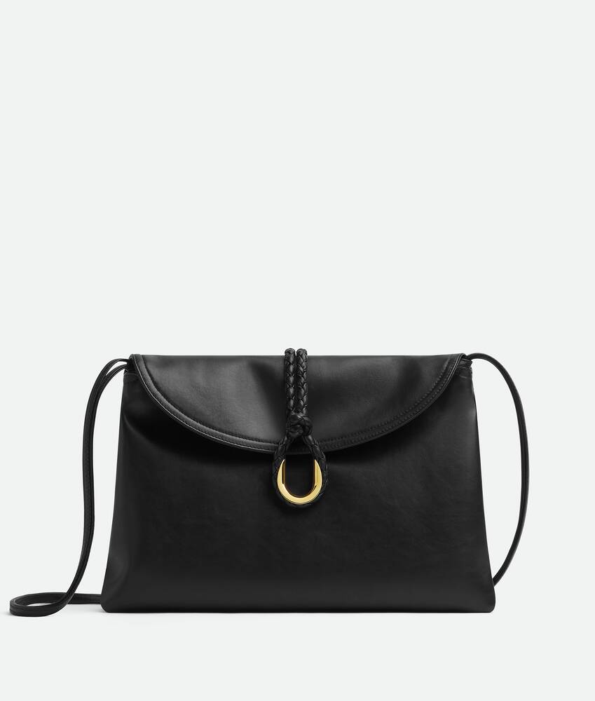Cross-body bag in smooth calfskin leather with double flap and fastening system consisting of metal elements and coaxial cord