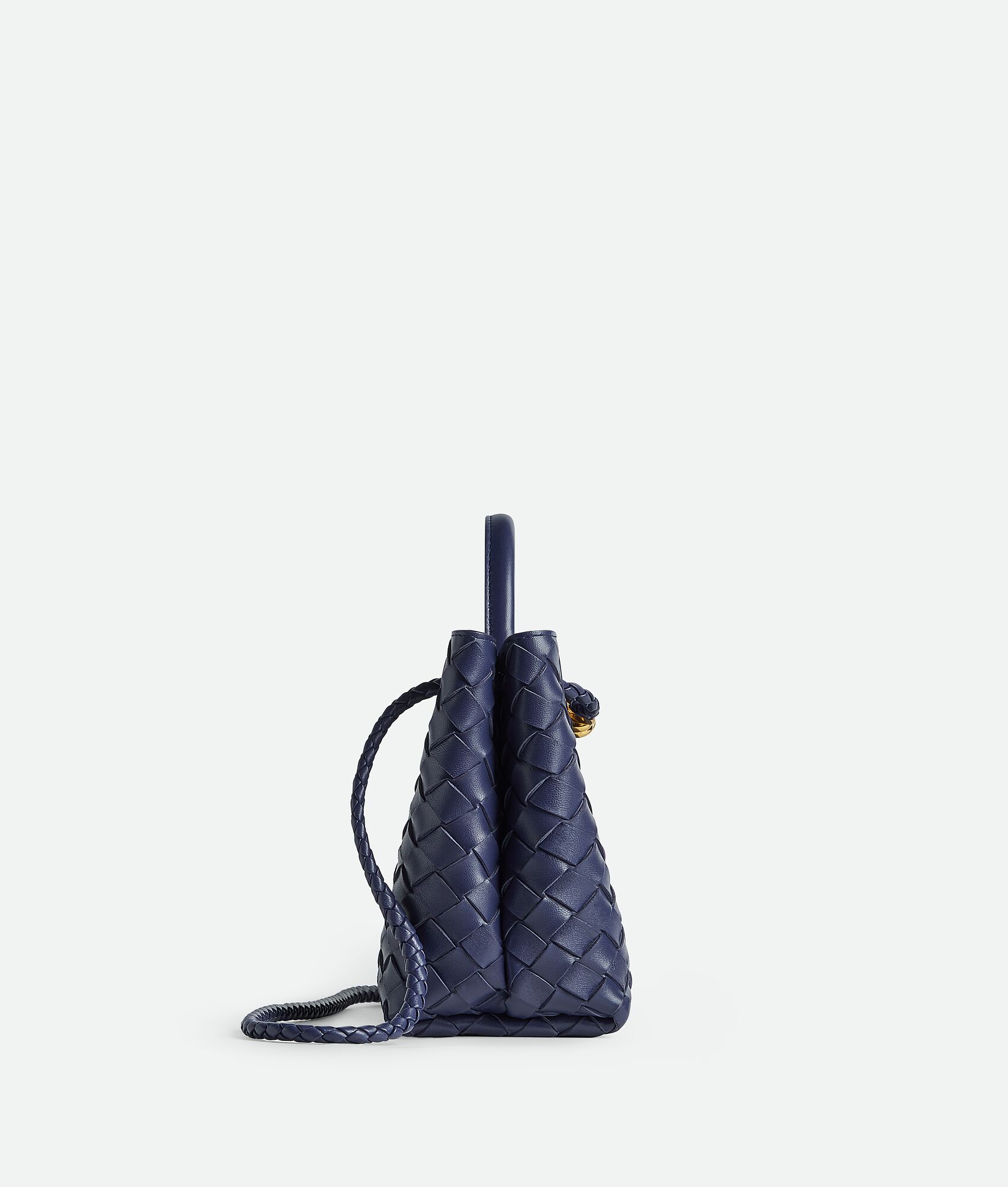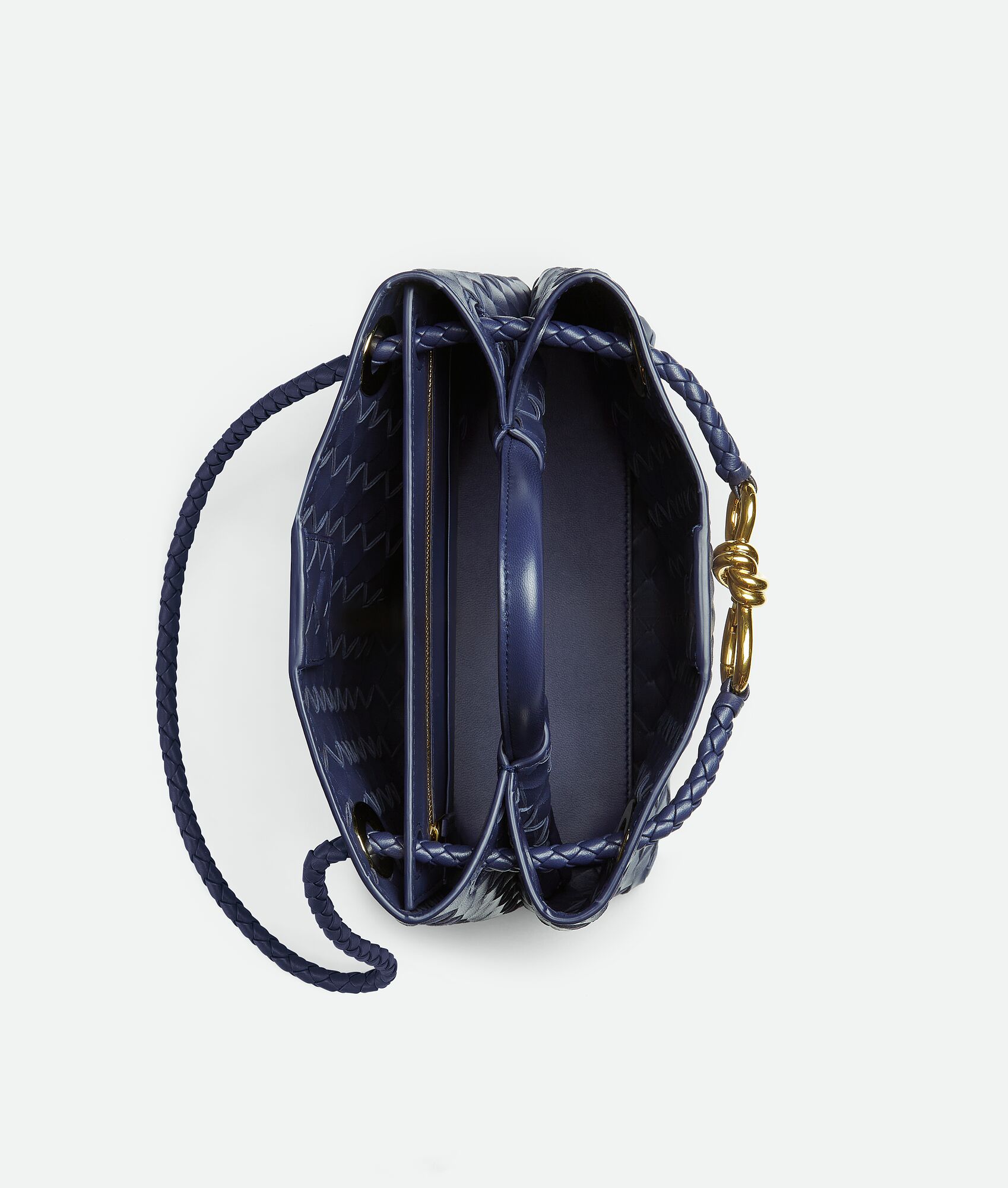 Small Intrecciato leather top handle bag with sliding cross-body strap Compartmented interior with one zippered pocket, one open pocket Magnetic closure