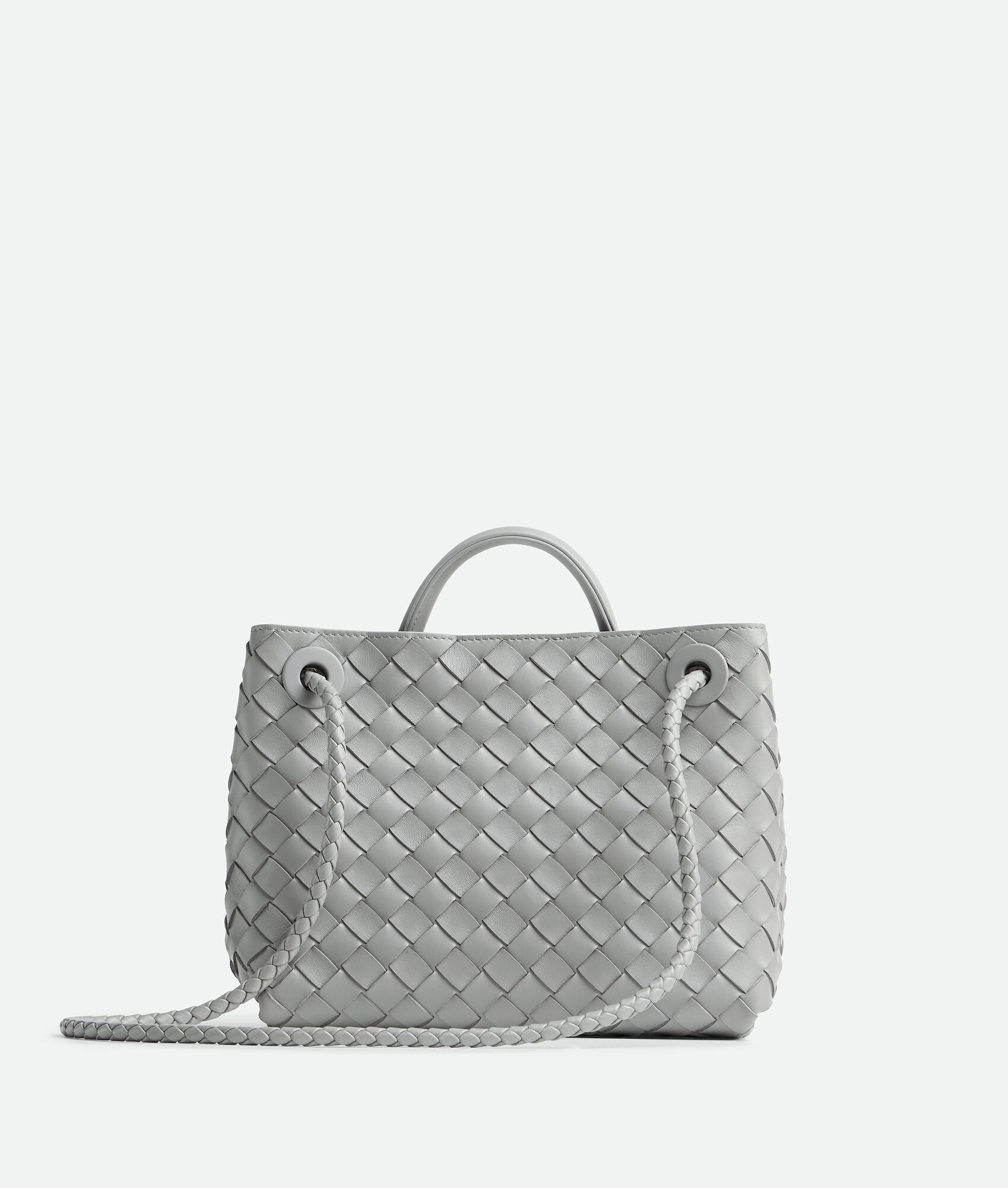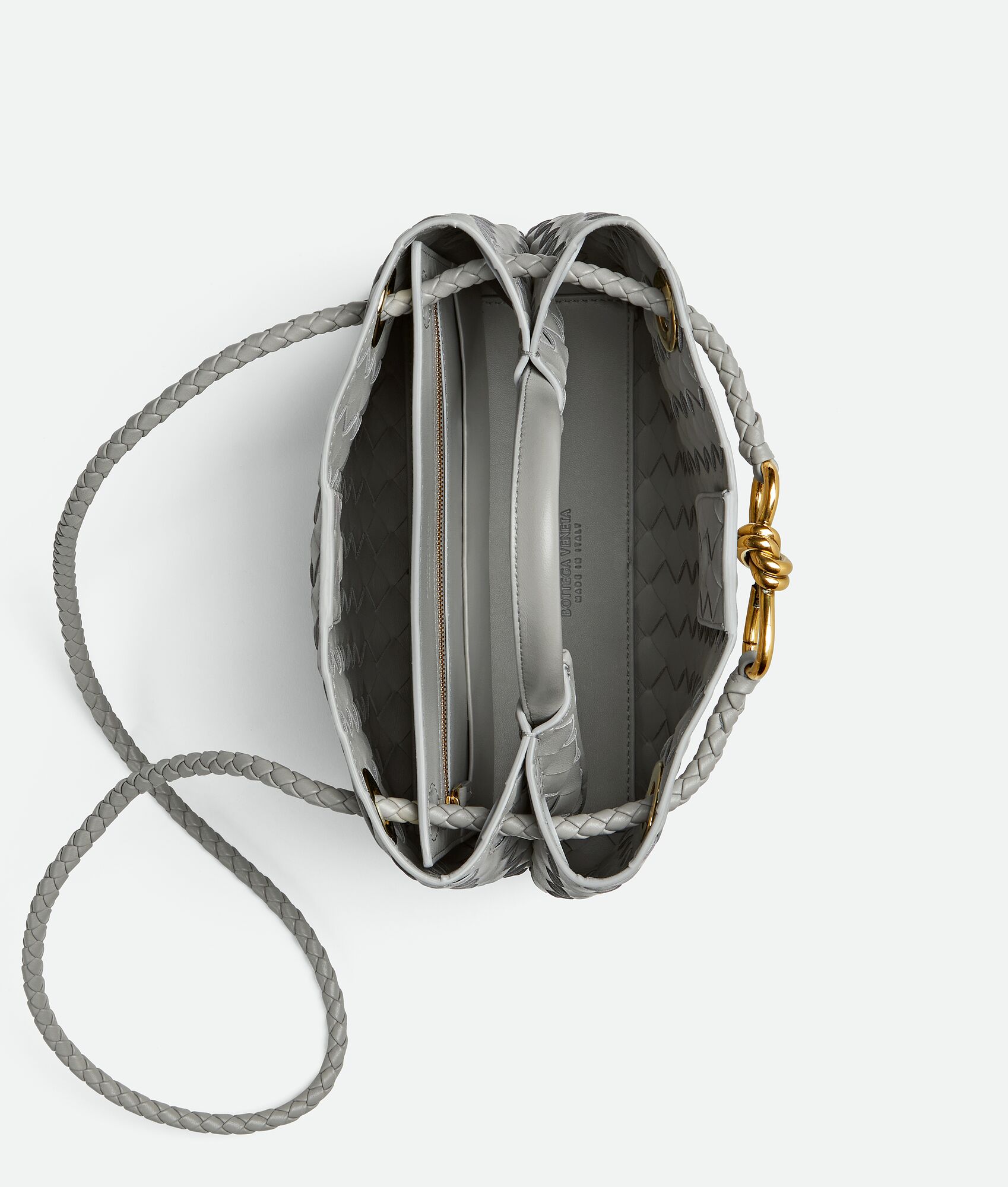 Small Intrecciato leather top handle bag with sliding cross-body strap Compartmented interior with one zippered pocket, two open pockets Magnetic closure