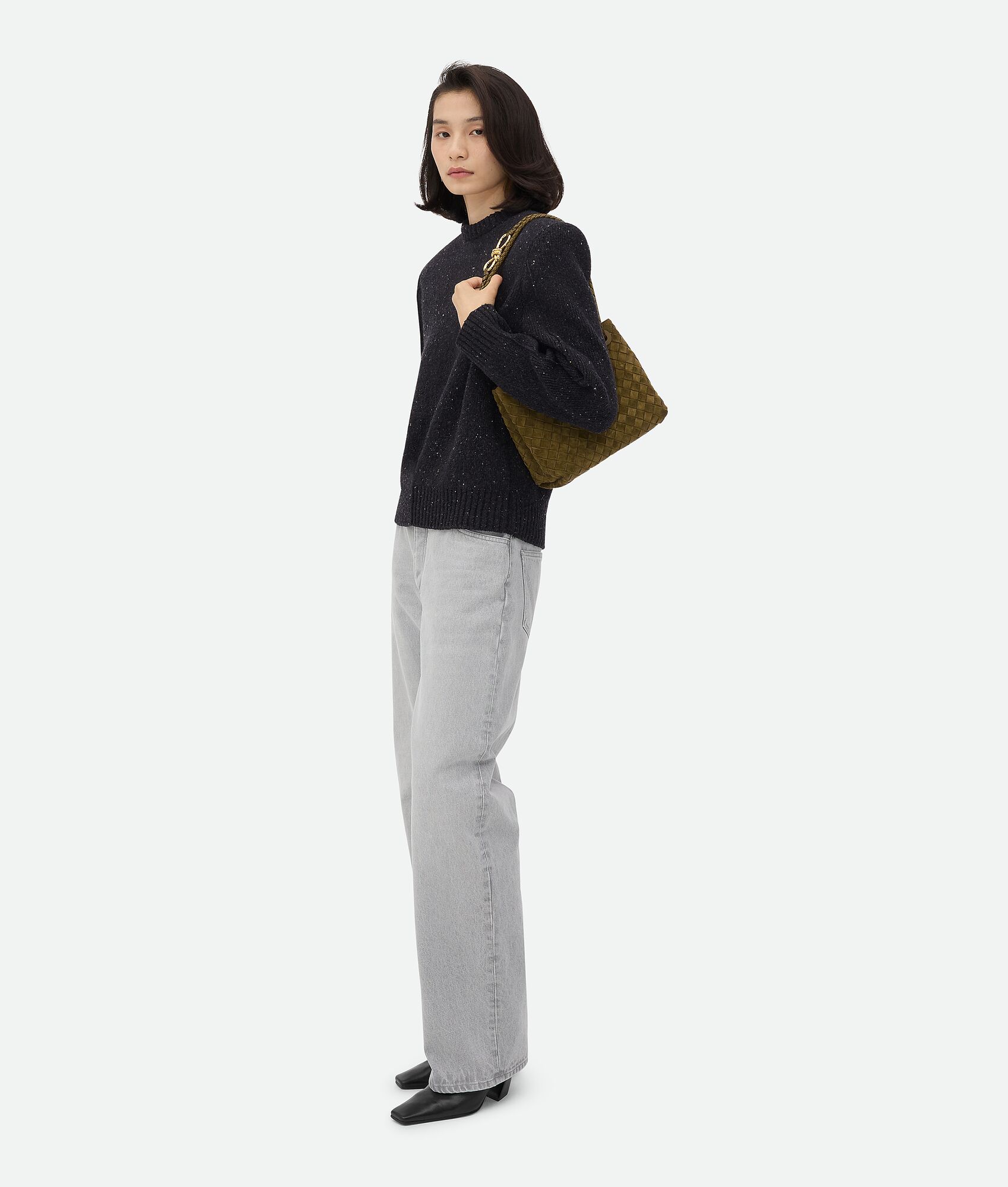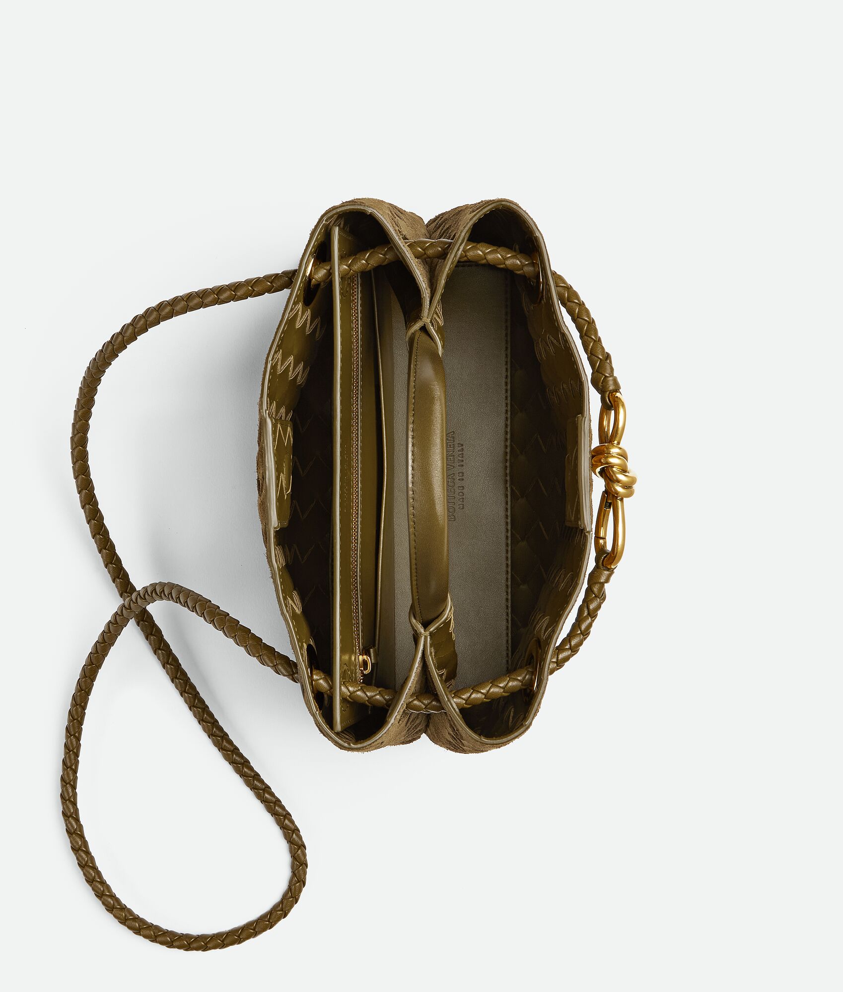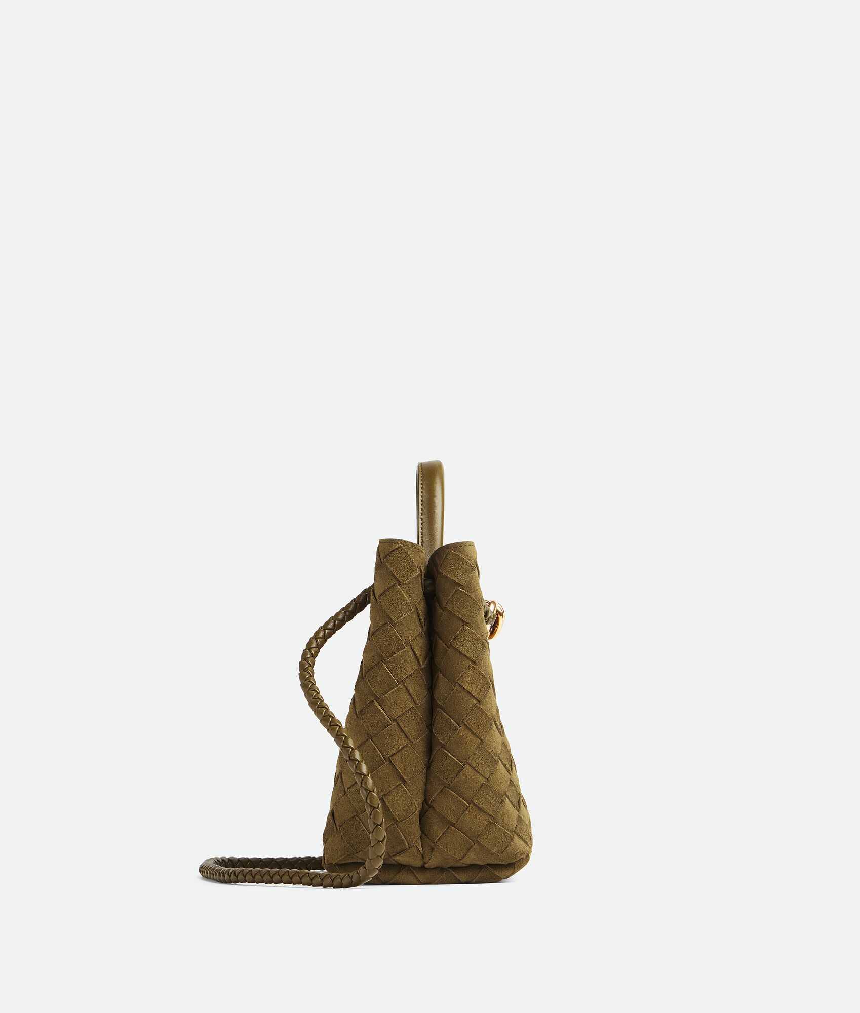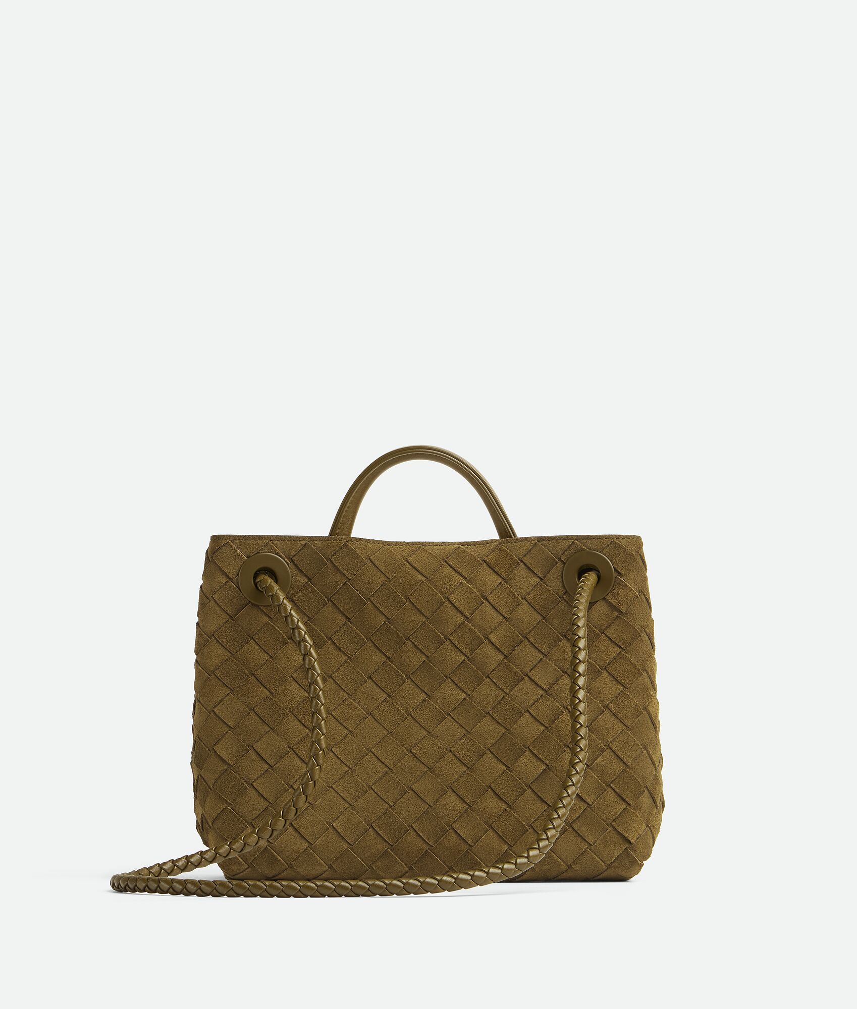 Small Intrecciato suede top handle bag with sliding cross-body strap Compartmented interior with one zipped pocket, two open pockets Magnetic closure