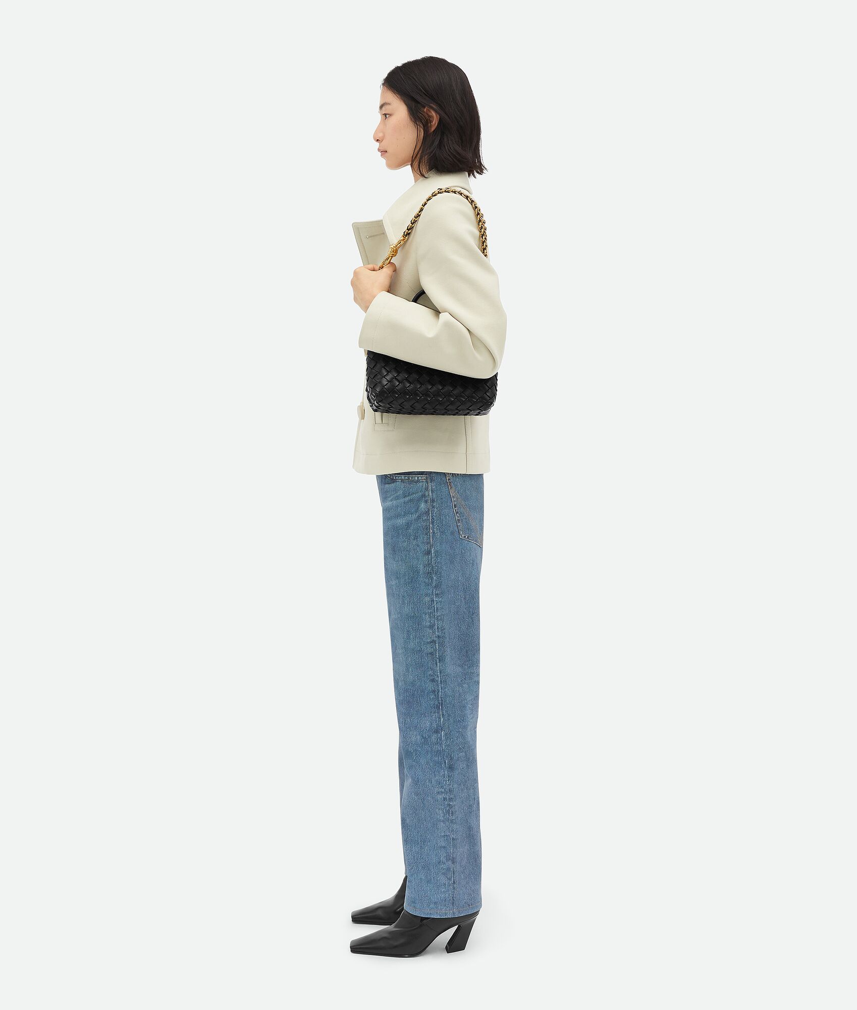 Small Intrecciato leather top handle bag with sliding cross-body chain Compartmented interior with one zipped pocket, two open pockets Magnetic closure