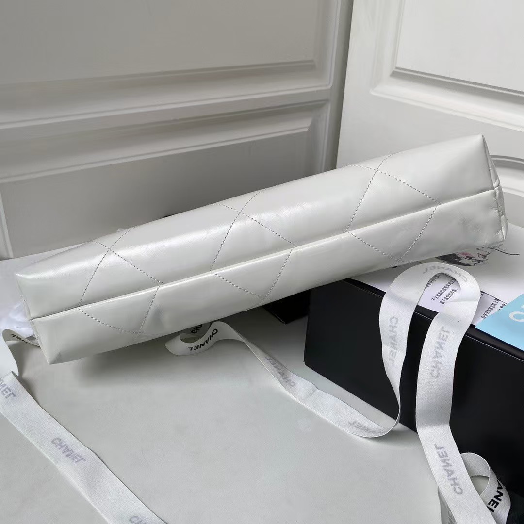 This horizontal version of the 22 Hobo Bag is made of white crinkled calfskin with gold-tone hardware and features signature diamond quilting, gold-tone metal CHANEL lettering on the front, a removable pouch and a long gold-tone and white leather chain.