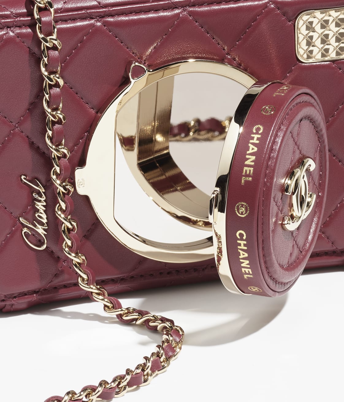 The new camera bag uses diamond quilted sheepskin to create a cute and playful camera shape. The “lens cover” is embellished with the classic double C logo. When opened, it is an exquisite and practical makeup mirror. There are 4 colors to choose from:black, white, dark beige and burgundy, and it comes with a signature leather chain shoulder strap.