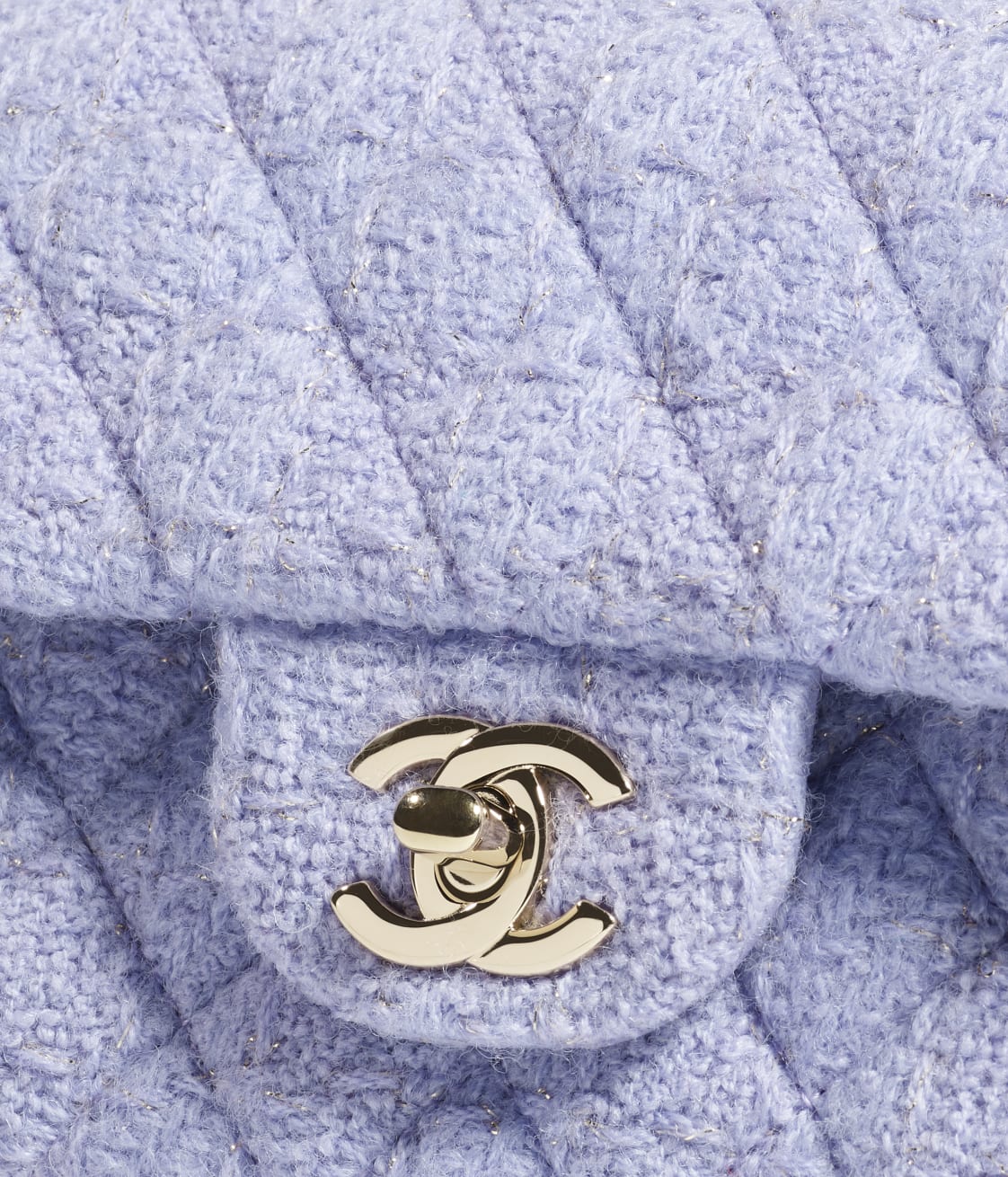 This mini classic rectangular flap bag is made of purple tweed with gold hardware, front flap with CC turnlock closure, half-moon back pocket and interwoven gold chain links and purple leather shoulder/crossbody strap.