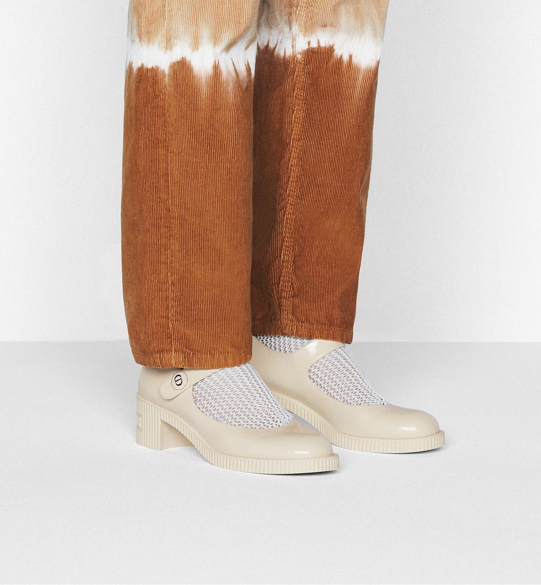 The D-Doll pump offers a new take on the classic Mary Jane in a Maria Grazia Chiuri variation. The white shiny calfskin style is embellished with a tonal enamel button with a gold-tone ‘CD’ signature. The ‘CHRISTIAN DIOR’ rubber block heel lends a relaxed touch to the elegant shoe.