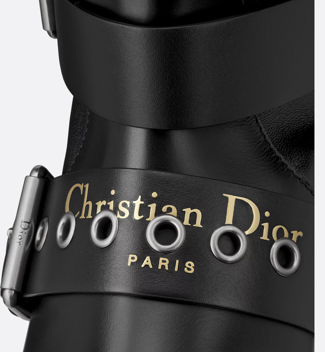 New for Cruise 2025, the D-Fight boot transcends the codes of womenswear with a distinct look. Crafted in black calfskin with a leather-effect stretch sock, it is embellished with a gold-tone Christian Dior Paris signature on the front eyelet strap. Easy to pull on, it is enhanced by multiple decorative adjustable straps with metal buckles, alluding to the spirit of the fashion show. Completed by a thick, notched EVA sole, the boot will lend a rock-and-roll touch to any look.