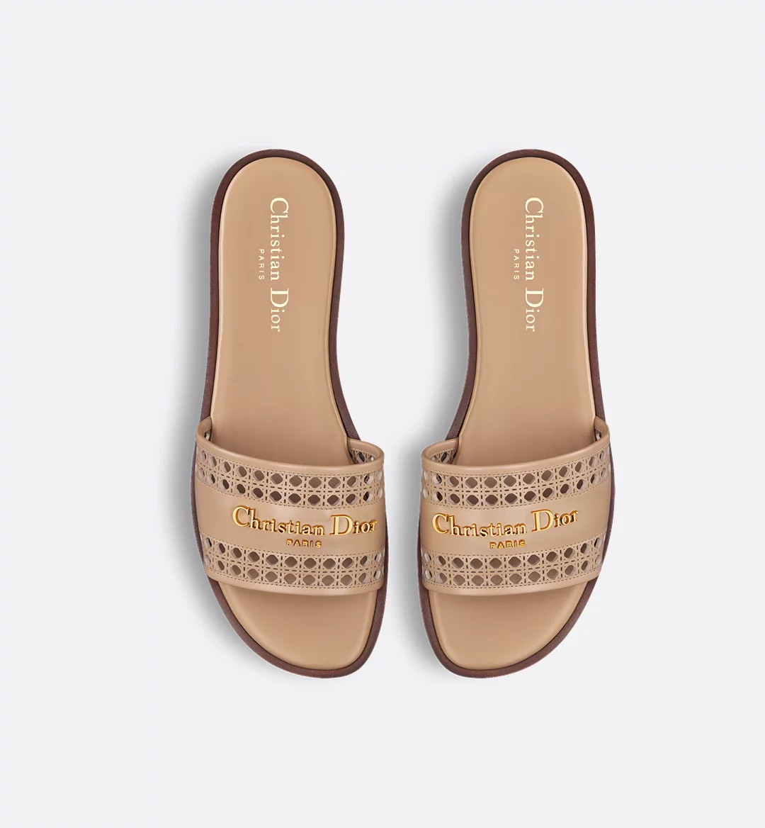 The D-Lane slide is an emblematic style with a timeless look. The beige openwork Microcannage calfskin upper is adorned with a gold-finish metal Christian Dior Paris signature, adding an instantly recognizable touch. The padded leather insole offers ultimate comfort while the streamlined design makes it easy to slip on for a laid-back look.