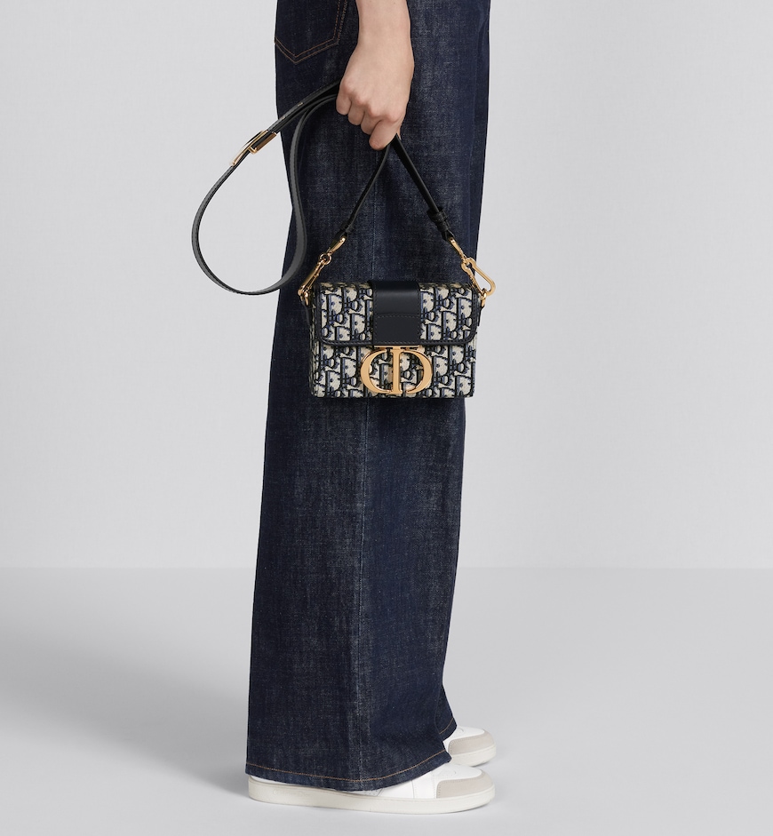 The 30 Montaigne line, inspired by the historic, emblematic address, presents essential pieces that portray the iconic codes of the House. The compact bag is crafted in blue Dior Oblique jacquard for an elegant and modern look. The flap is embellished with an antique gold-finish metal CD clasp, inspired by the seal of a Christian Dior perfume bottle. Refined details such as an embossed 30 Montaigne signature on the back and the military-inspired buckle define this unique design. Featuring an adjustable leather shoulder strap, the 30 Montaigne box bag may be carried by hand, worn over the shoulder or crossbody.