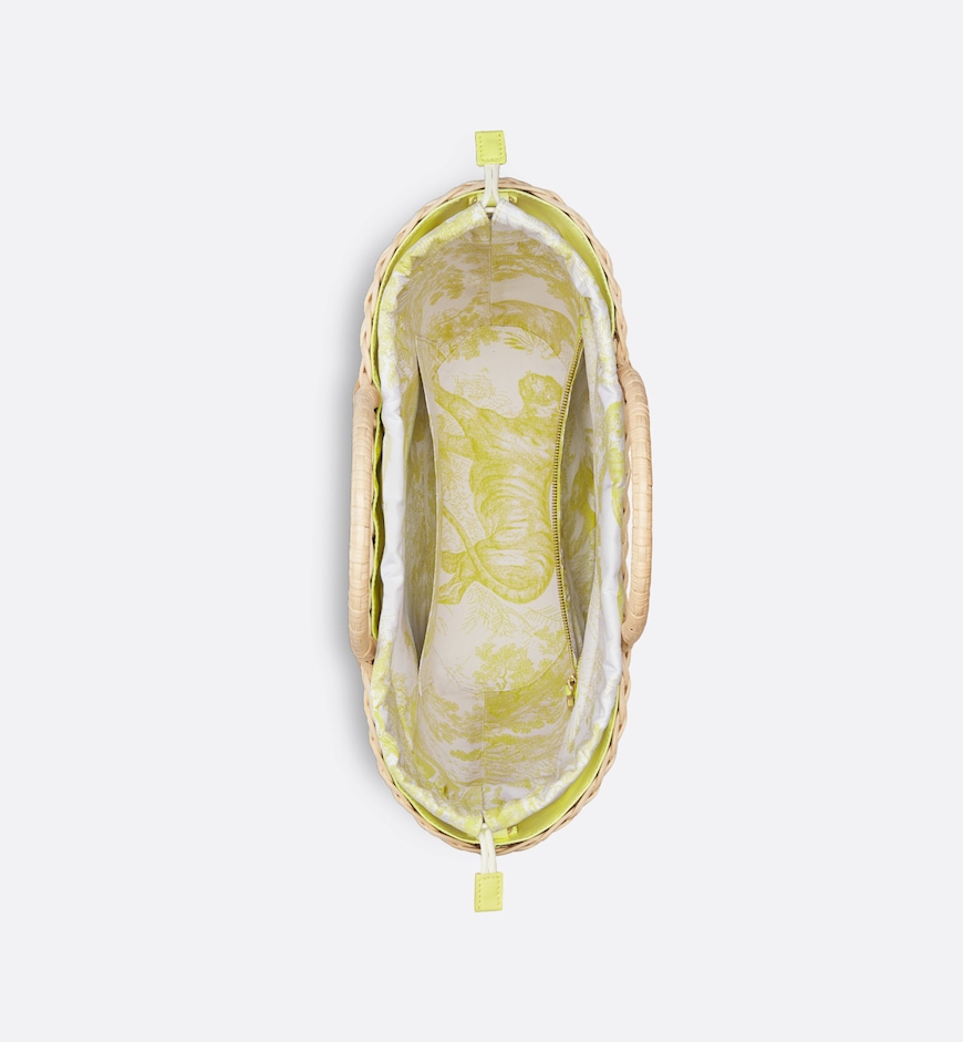 Part of the Dioriviera capsule, the hat basket bag stands out with its elegant silhouette combining functionality and refinement. A testament to House savoir-faire, the bag is hand-woven using artisanal techniques in natural wicker. The style features wicker top handles and a lemon yellow Toile de Jouy jacquard interior drawstring pouch. The Christian Dior Paris signature adorns the front. Equipped with a removable tonal zip pouch, the spacious bag is completed by an adjustable and removable embroidered shoulder strap that allows it to be carried by hand, worn over the shoulder or crossbody.