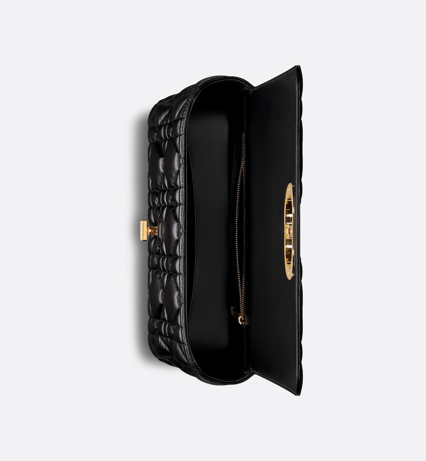 The Dior Caro bag combines modernity with timeless elegance. Crafted in black calfskin, it is distinguished by its original quilted-effect Macrocannage stitching. The bag features a flap adorned with an antique gold-finish metal CD twist clasp, inspired by the seal of a Christian Dior perfume bottle. The detachable chain shoulder strap with CD signature links allows the large bag to be carried by hand or worn over the shoulder and may be replaced by one of the House’s wide embroidered straps for day or evening attire.