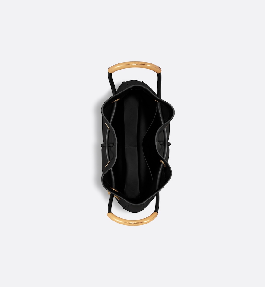 New for Fall 2024, the Dior Nolita bag redefines House codes of modern elegance with a refined and contemporary silhouette. The black calfskin is complemented by structured top handles embellished with antique gold-finish metal, as well as sliding D.I.O.R. charms which lend a touch of movement. The drawstring closure reveals a practical interior with a slip pocket, while the adjustable and removable leather strap allows the large bag to be carried by hand, worn over the shoulder or crossbody.