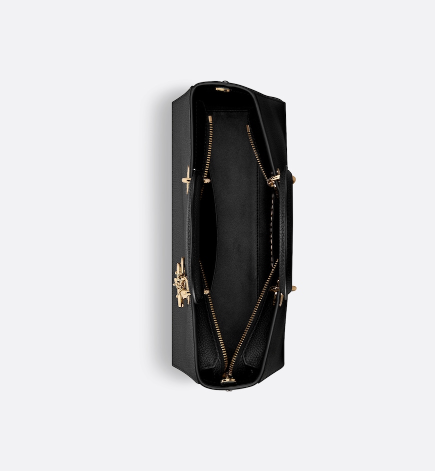 New for Summer 2024, the Lady D-Sire bag draws inspiration from the signature elegance of the Lady Dior design. Reimagined with a casual style for an urban look, the lightweight black grained Taurillon leather feels soft to the touch yet offers excellent durability. The large style is embellished with pale gold-finish metal D.I.O.R. charms highlighting the silhouette. Showcasing a removable, thin leather shoulder strap, the unique bag can be carried by hand or over the shoulder.