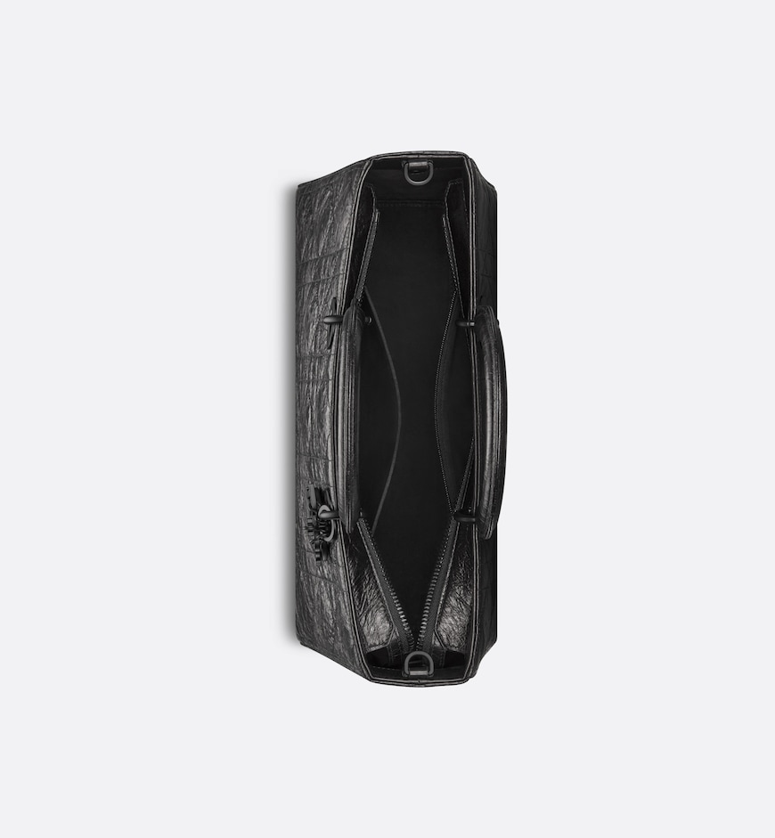 New for the season and appearing in the Spring-Summer 2024 Fashion Show, the Lady D-Sire bag draws inspiration from the iconic elegance of the Lady Dior design. Reimagined with a casual style for an urban look, the black crinkled calfskin is accented by Macrocannage topstitching, while tonal ultra-matte metal D.I.O.R. charms lend a modern touch. Featuring a thin, removable leather shoulder strap, the unique large bag can be carried by hand or worn over the shoulder.
