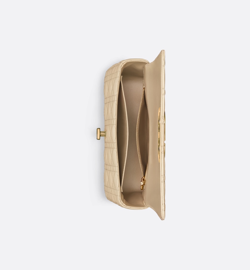 The Dior Caro bag combines modernity with timeless elegance. The style is crafted in beige supple calfskin with Cannage stitching. The bag showcases a flap adorned with an antique gold-finish metal CD twist clasp, inspired by the seal of a Christian Dior perfume bottle. The detachable chain shoulder strap with CD signature links allows the medium bag to be carried by hand, worn over the shoulder or crossbody, and may be replaced by one of the House’s wide embroidered straps for day or evening attire.