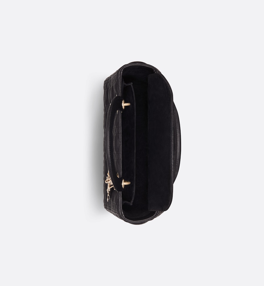 The Lady Dior bag epitomizes the House’s vision of elegance and beauty. Sleek and refined, the timeless creation is crafted in black grained calfskin with Cannage stitching, creating the instantly recognizable quilted texture. The pale gold-finish metal D.I.O.R. charms offer an elegant appeal. Featuring a thin, removable leather shoulder strap, the medium Lady Dior bag can be carried by hand or worn crossbody.