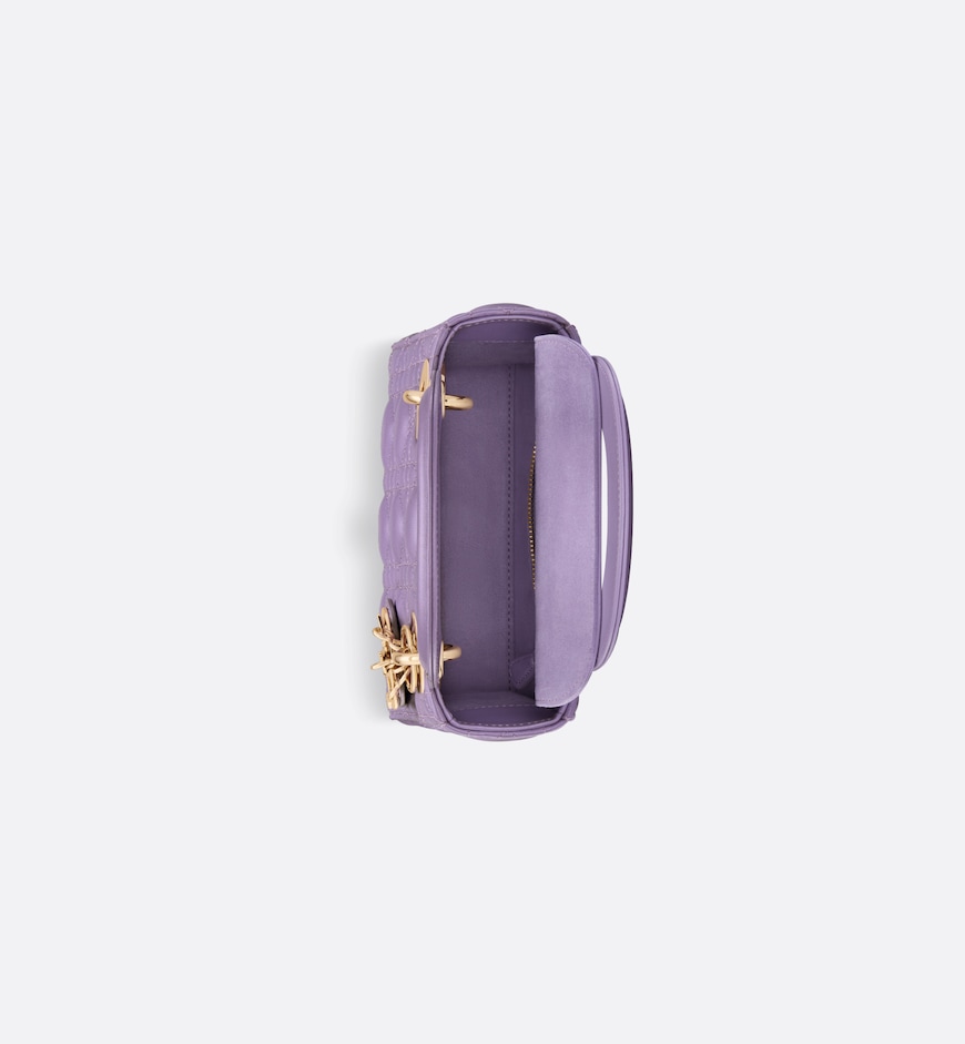 The Lady Dior bag epitomizes the House’s vision of elegance and beauty. Sleek and refined, the style is timeless. It is crafted in lilac lambskin with Cannage stitching, creating the instantly recognizable quilted texture. The pale gold-finish metal D.I.O.R. charms embellish and illuminate its silhouette. Featuring a removable chain shoulder strap, the miniature Lady Dior bag can be carried by hand or worn crossbody