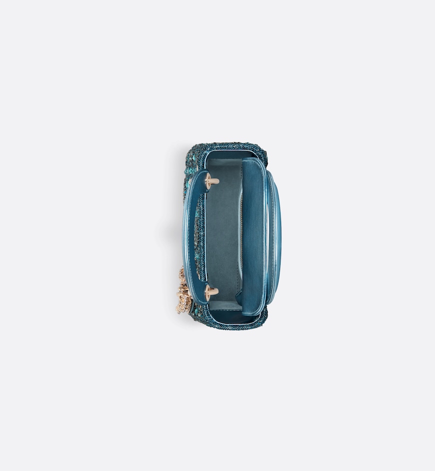 The Lady Dior bag epitomizes Dior’s vision of elegance and beauty. It demonstrates the House’s unique leather craftsmanship and is offered in celestial blue satin, embroidered with a multitude of beads in a hallmark Cannage-motif design, while the handles are made with tonal metallic calfskin. The pale gold-finish metal D.I.O.R. charms are adorned with white crystals and further embellish its silhouette. The miniature style, with its removable chain shoulder strap, can be carried by hand or worn crossbody and will be the ideal evening companion.