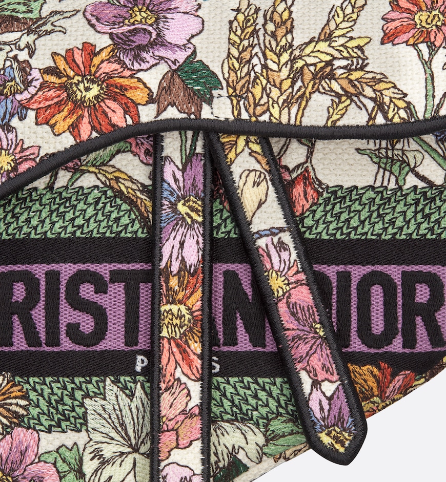 Maria Grazia Chiuri brings a fresh update to the iconic Saddle bag. Fully embroidered, it features the white and multicolor Dior 4 Saisons été motif by Pietro Ruffo, showcasing summery flowers and plants in a bucolic design. The legendary style features a Saddle flap and a D stirrup clasp on a magnetic strap, as well as an antique gold-finish metal CD signature on each side of the handle. The bag can be carried by hand or worn over the shoulder, may be customized with different shoulder straps and can be paired with other Dior 4 Saisons creations.