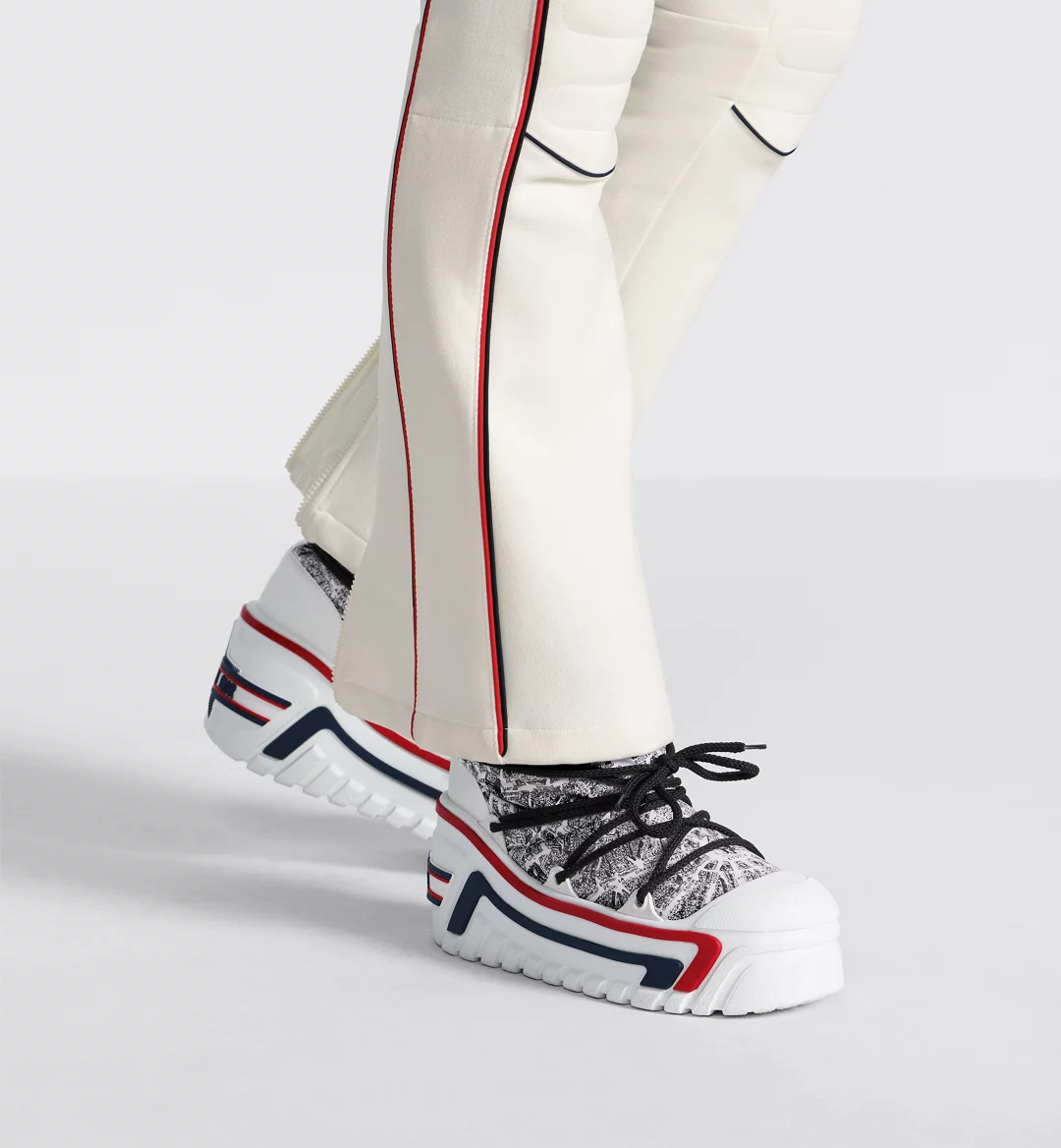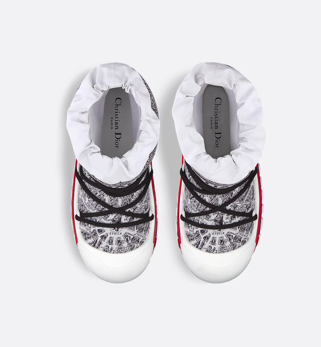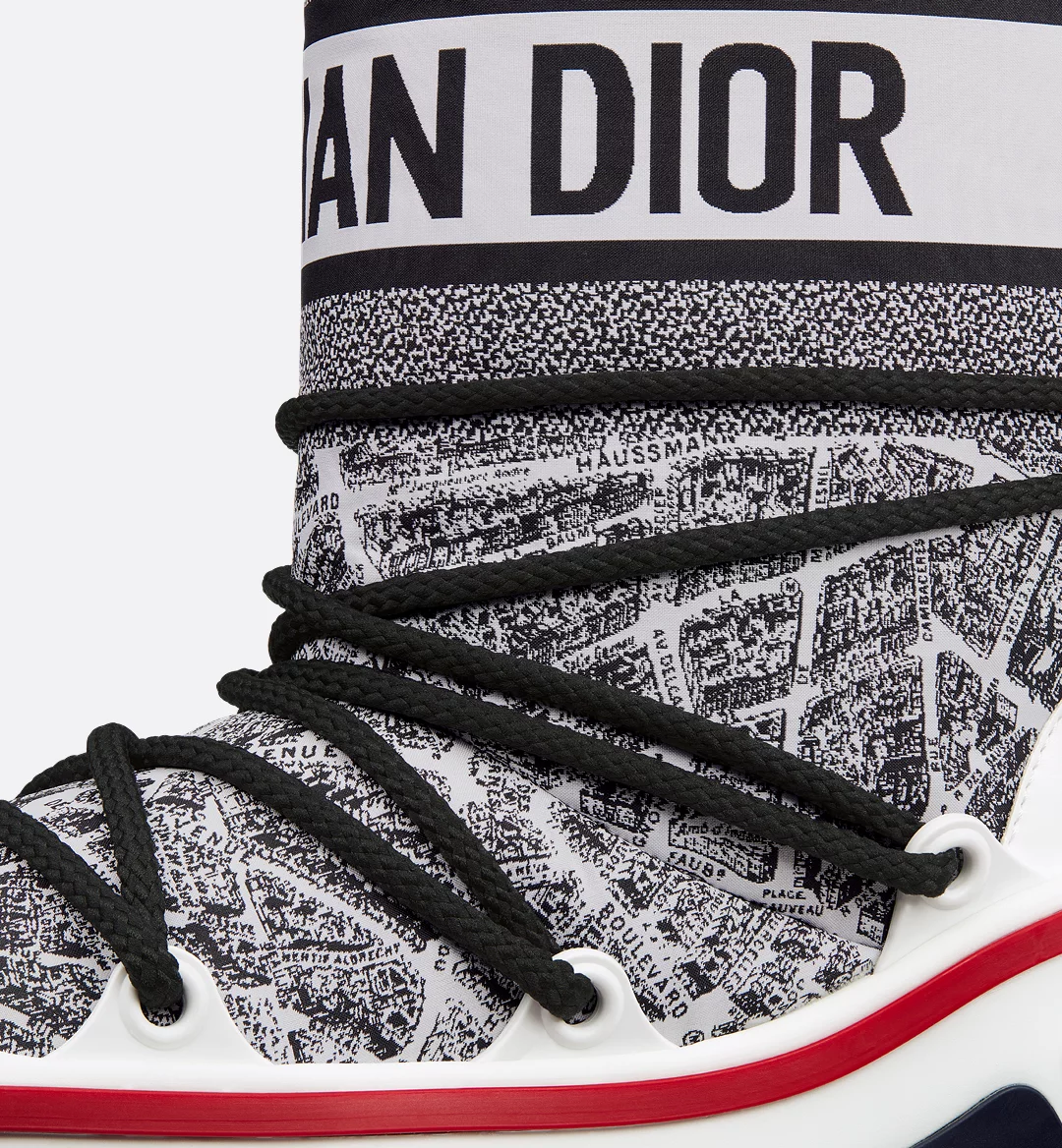 The apr??s-ski boot, created for the DiorAlps capsule, is distinguished by its design. The white and black Plan de Paris shiny nylon upper is inspired by House archives and structured around Avenue Montaigne. Completed by cross lacing for an optimal fit, it showcases the Christian Dior signature on the upper as well as the supple and lightweight white three-tone sole, further embellished with a hallmark star. The technical ankle boot, with its low silhouette, may be worn in either the city or the mountains, and may be coordinated with other DiorAlps creations.
