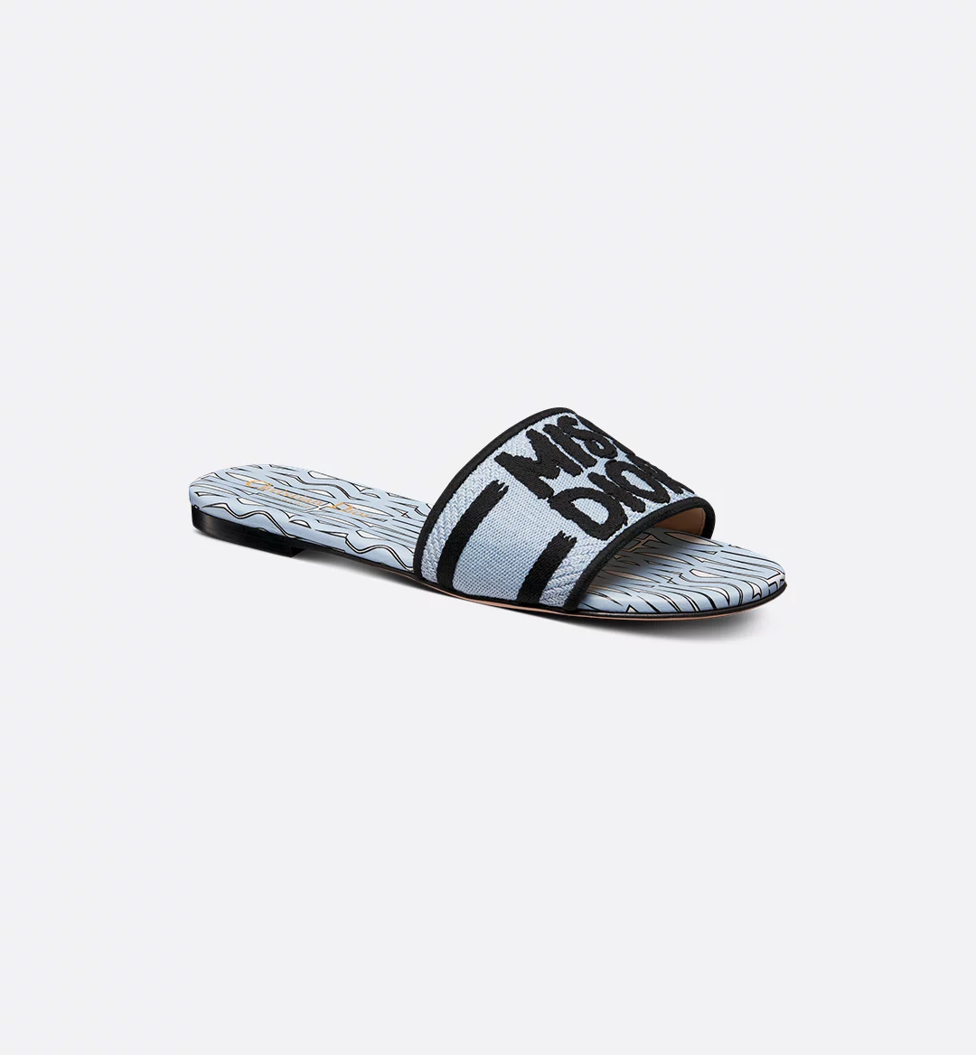 The Dway slide is a timeless style showcasing the collection’s hallmark pale blue Miss Dior Allover motif, inspired by the Marc Bohan for Dior archives in a modern take on the 1960s. The pale blue cotton upper is embroidered with the black Miss Dior Graffiti signature. The sleek design slips on easily for a laid-back style. The shoe can be paired with other Miss Dior Allover creations.