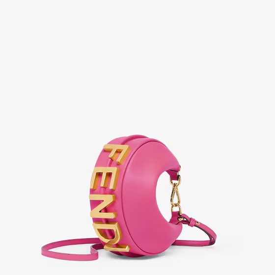 Mini hobo bag made of soft fuchsia leather, embellished with vintage gold metal FENDI lettering.