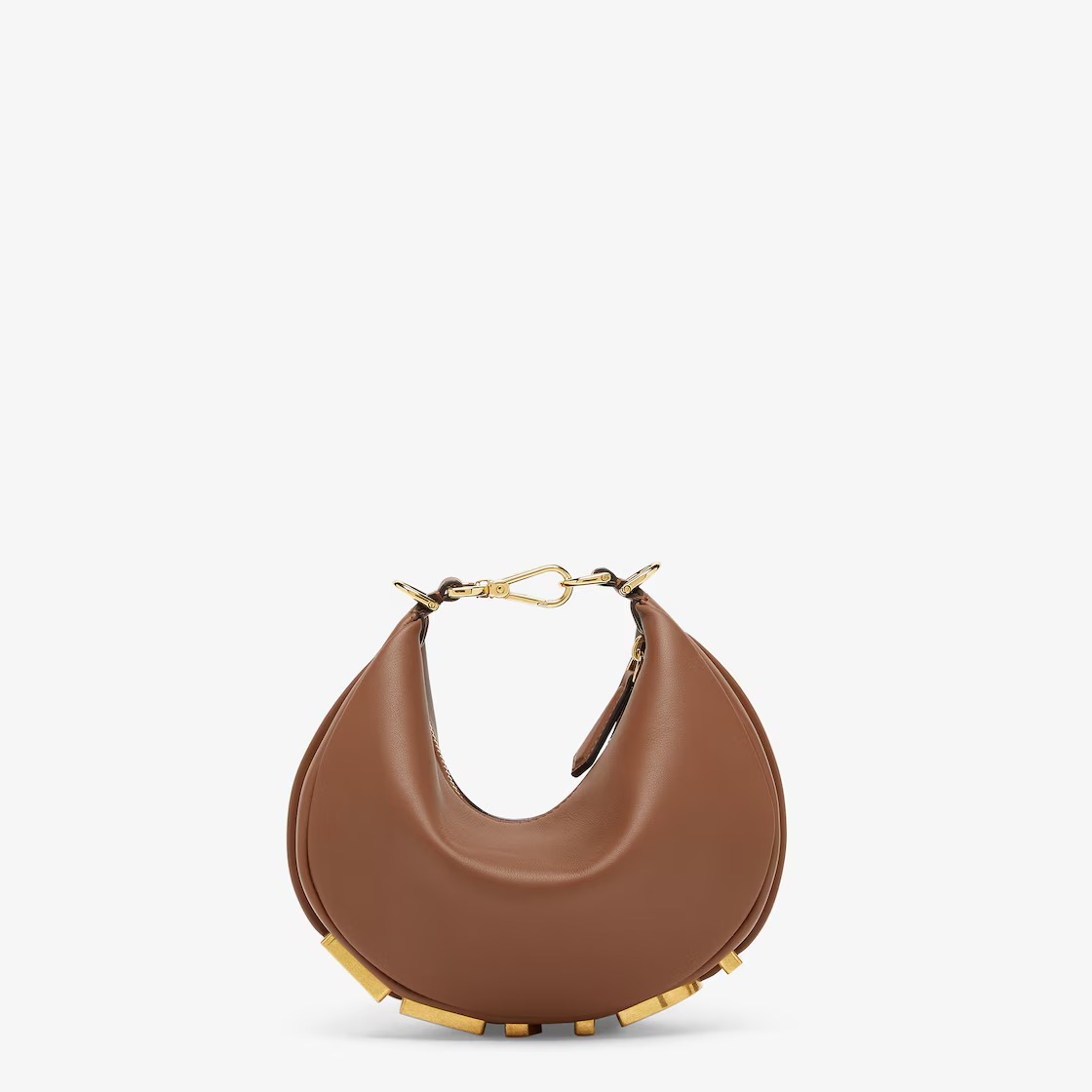 Mini hobo bag made of soft brown leather, embellished with vintage gold metal FENDI lettering.