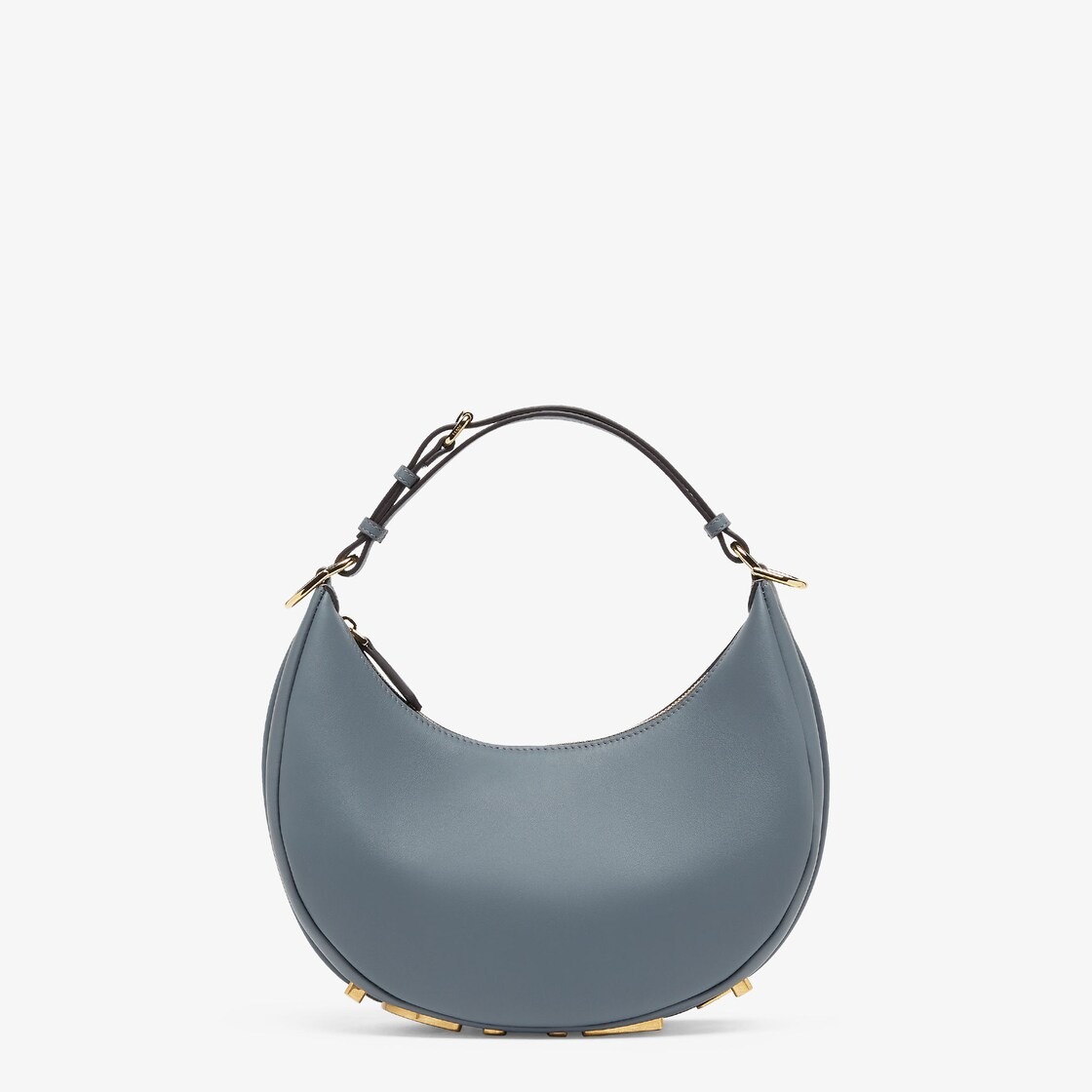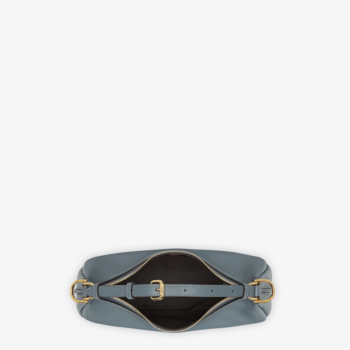 Small hobo bag made of soft, blue leather, decorated with vintage gold metal FENDI lettering visible when wearing the bag under the arm.