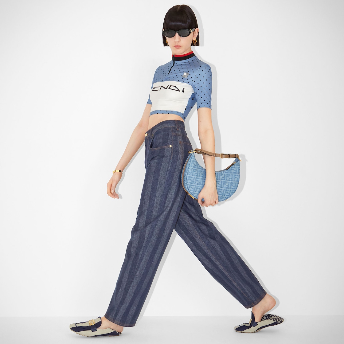 Made of light blue denim fabric with an FF motif, trimmed with beige calfskin and embellished with vintage gold metal FENDI lettering at the bottom, visible when wearing the bag under the arm.
