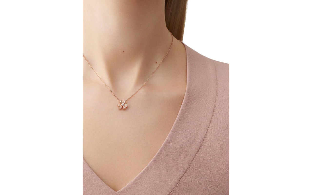 Frivole pendant, mini model, 18K rose gold, round diamonds; diamond quality DEF, IF to VVS.The pendant is attached to the necklace’s chain
