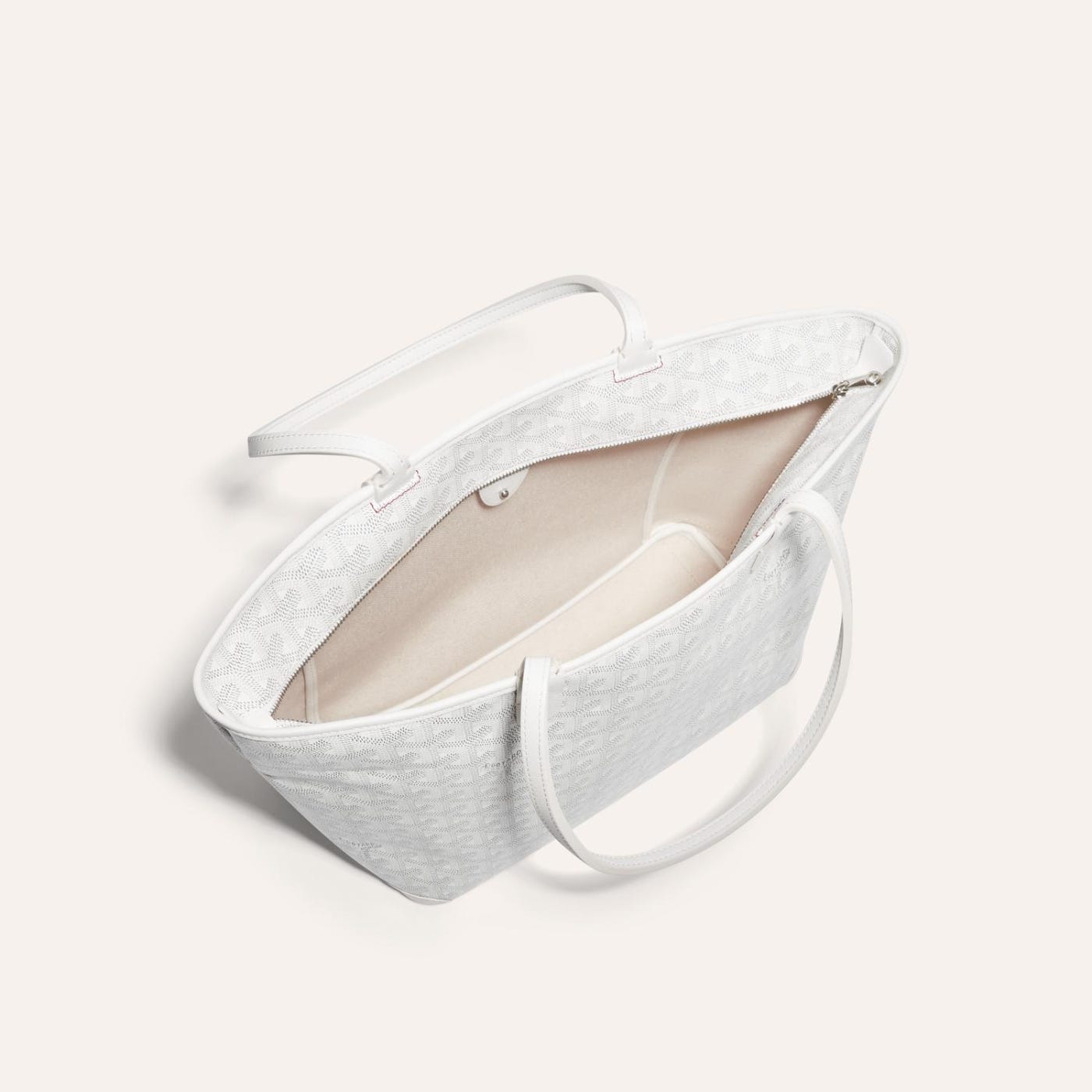 This Goyard Artois PM handbag is crafted in white Goyardine canvas and Chevroches calfskin with palladium tone hardware, tonal stitching, two flat white leather handles, zip top closure and an interior floating pocket.