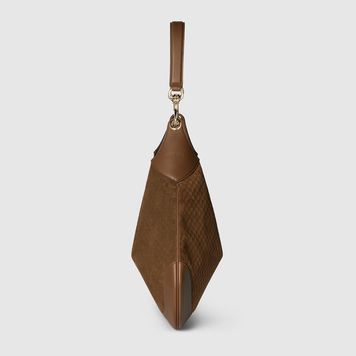 Introducing the Gucci B, which draws inspiration from a 1950s archival style. This medium shoulder bag, embodying the essence of its mid-20th century design origins,is crafted from soft suede which drapes on the body.