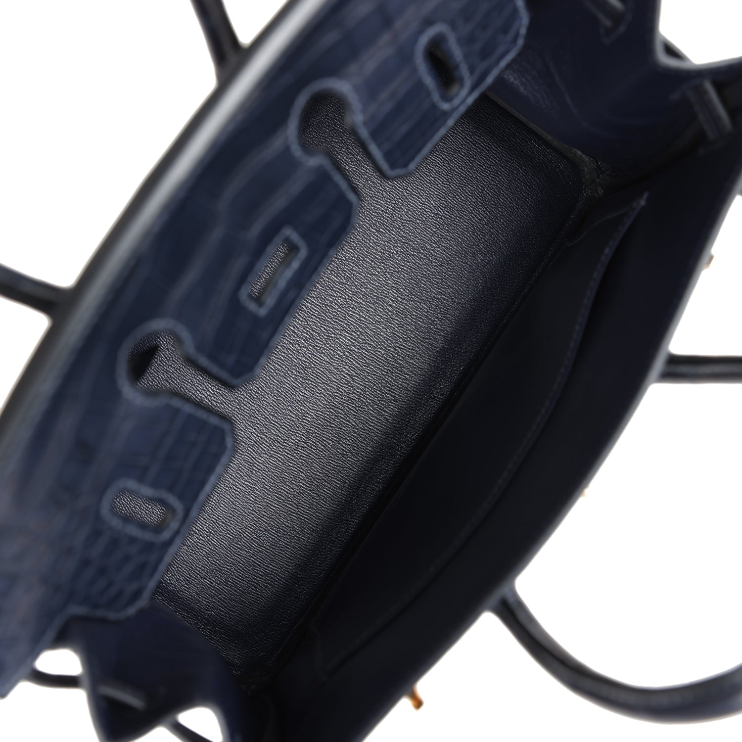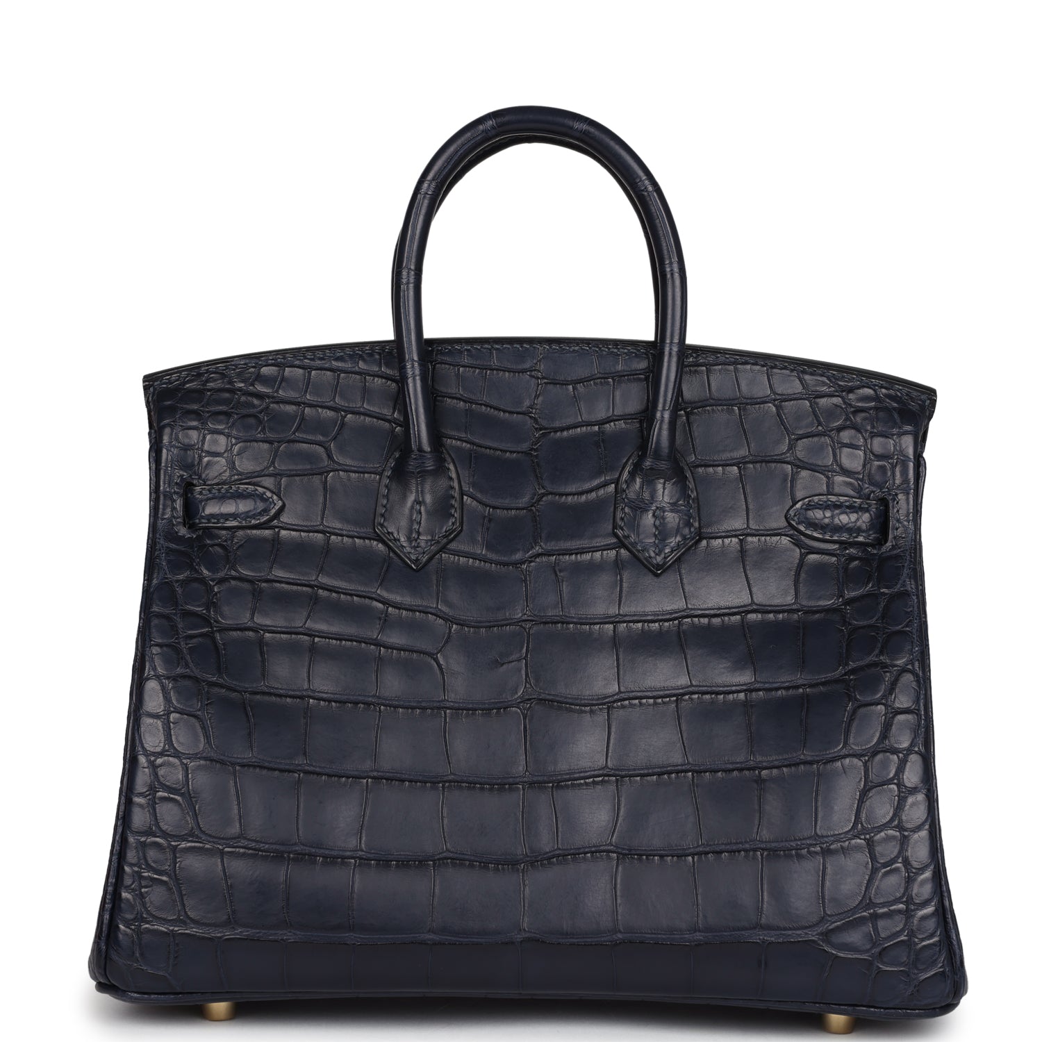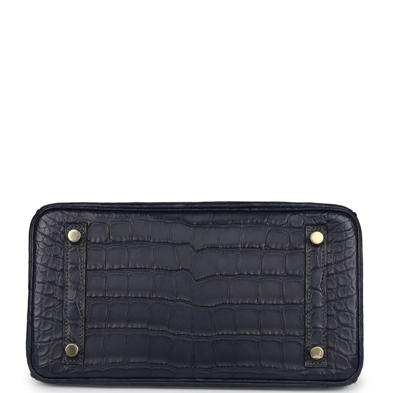 This Birkin 25 is in Bleu IndigoMississippiensis Matte Alligator leather with gold hardware, tonal stitching, front flap with two straps, front toggle closure, clochette with lock and two keys, and double rolled handles.