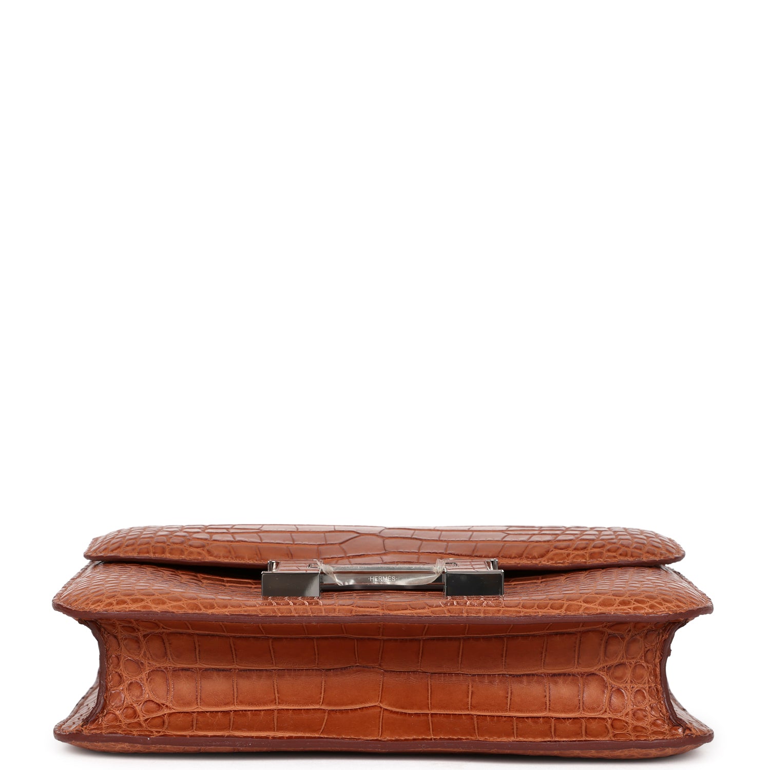 This Constance 1-24 is in Gold Matte Alligator Mississippiensis leather with Marquette and palladium hardware and has tonal stitching, a metal “H” snap lock closure and adjustable shoulder strap.