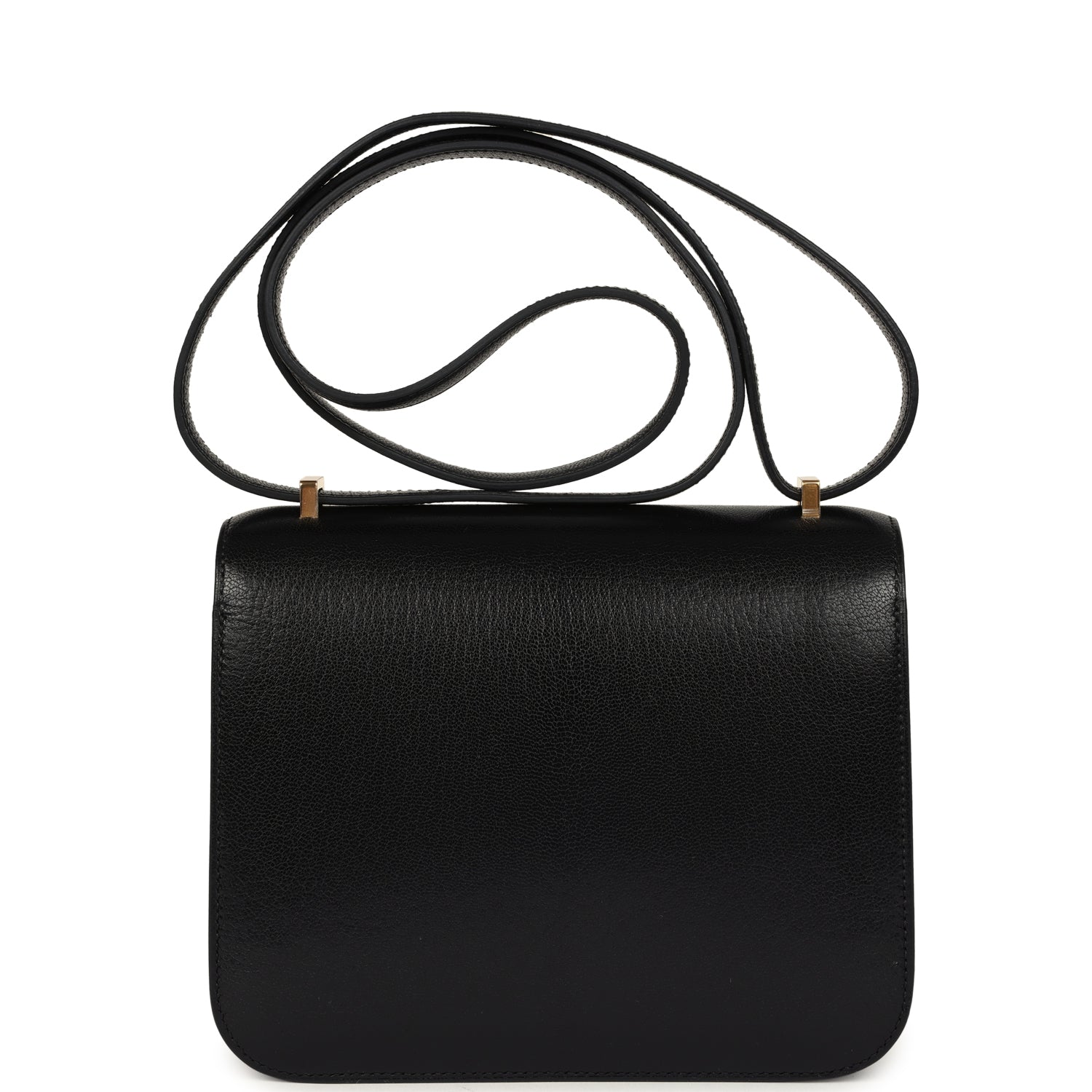 This Constance is inBlackchevre chamkila leatherwith gold hardware and hastonal stitching, ametal “H” snap lock closure and adjustable shoulder strap.