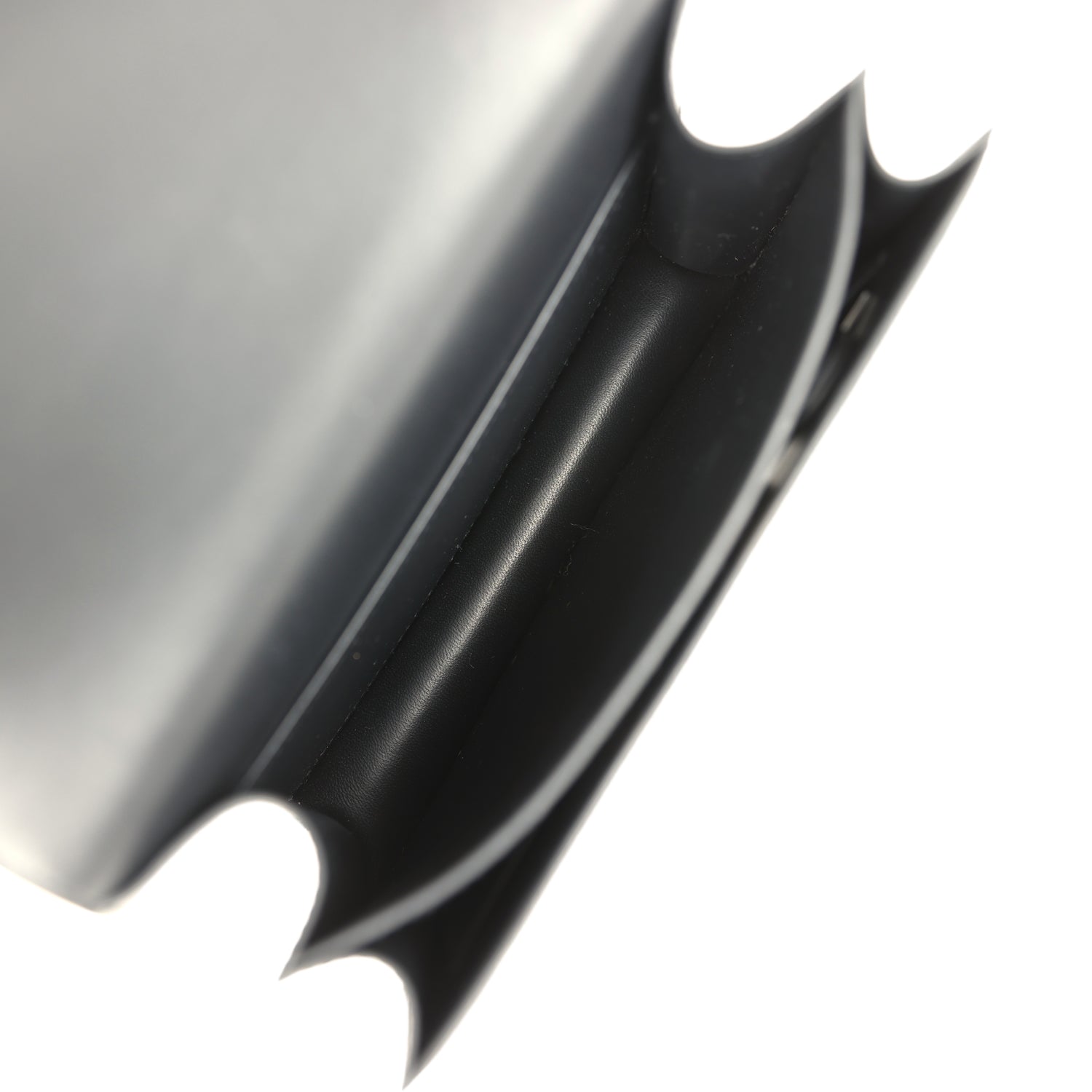 The interior is lined with Black lambskin and has an open pocket on the front wall, a center divide, removable mirror and a slit pocket on the back wall.