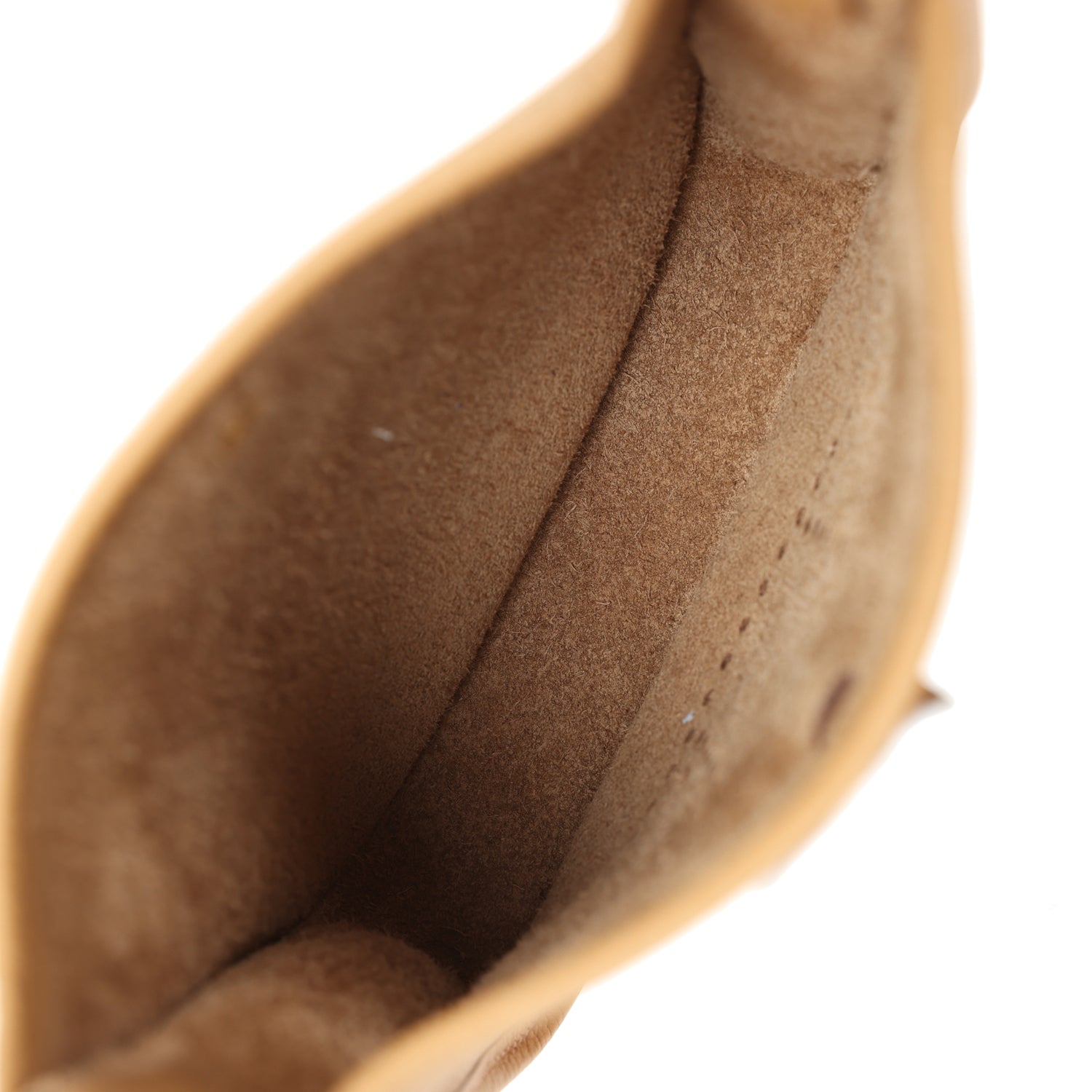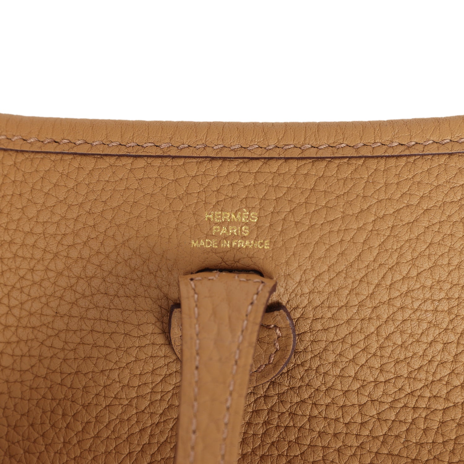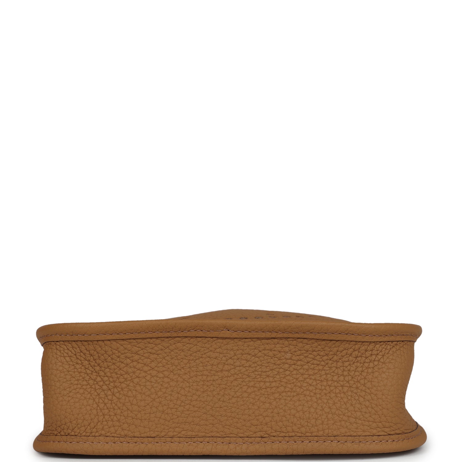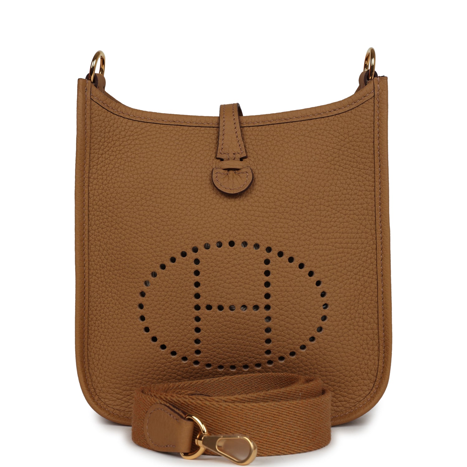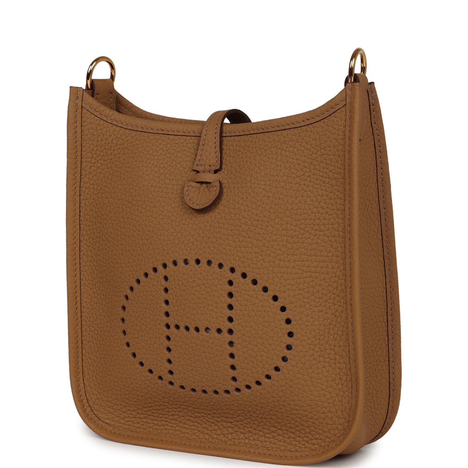 This Evelyne is in Biscuit clemence leather withgold hardware and has tonal stitching, pull tab top closure and aBiscuit removable canvas and leather shoulder/crossbody strap.