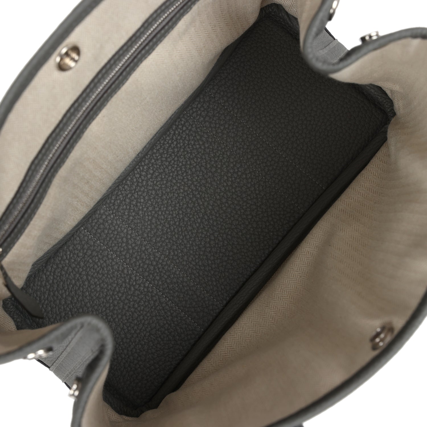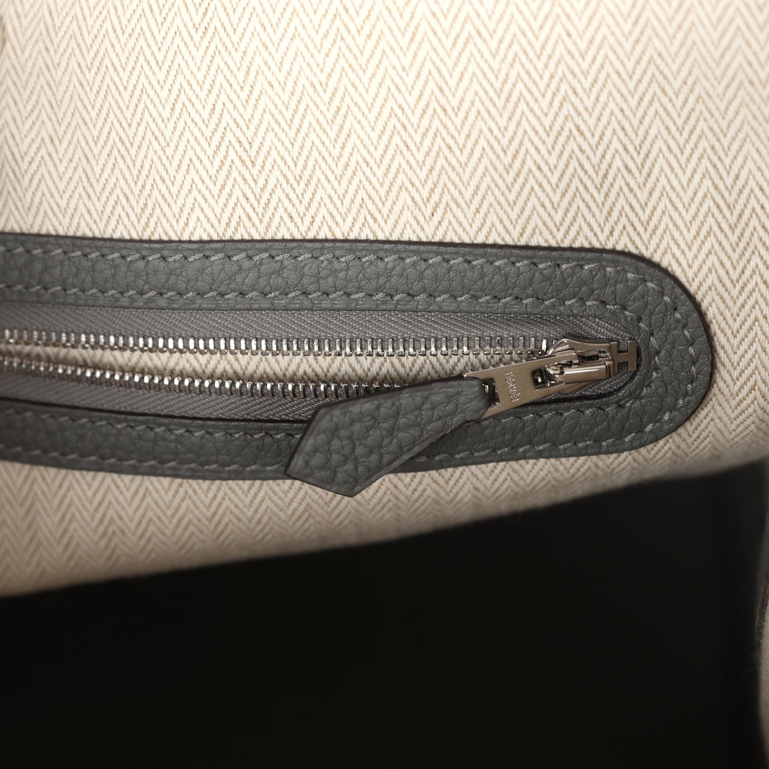 The interior is lined with herringbone toile and Gris Meyer leather with one zippered pocket.